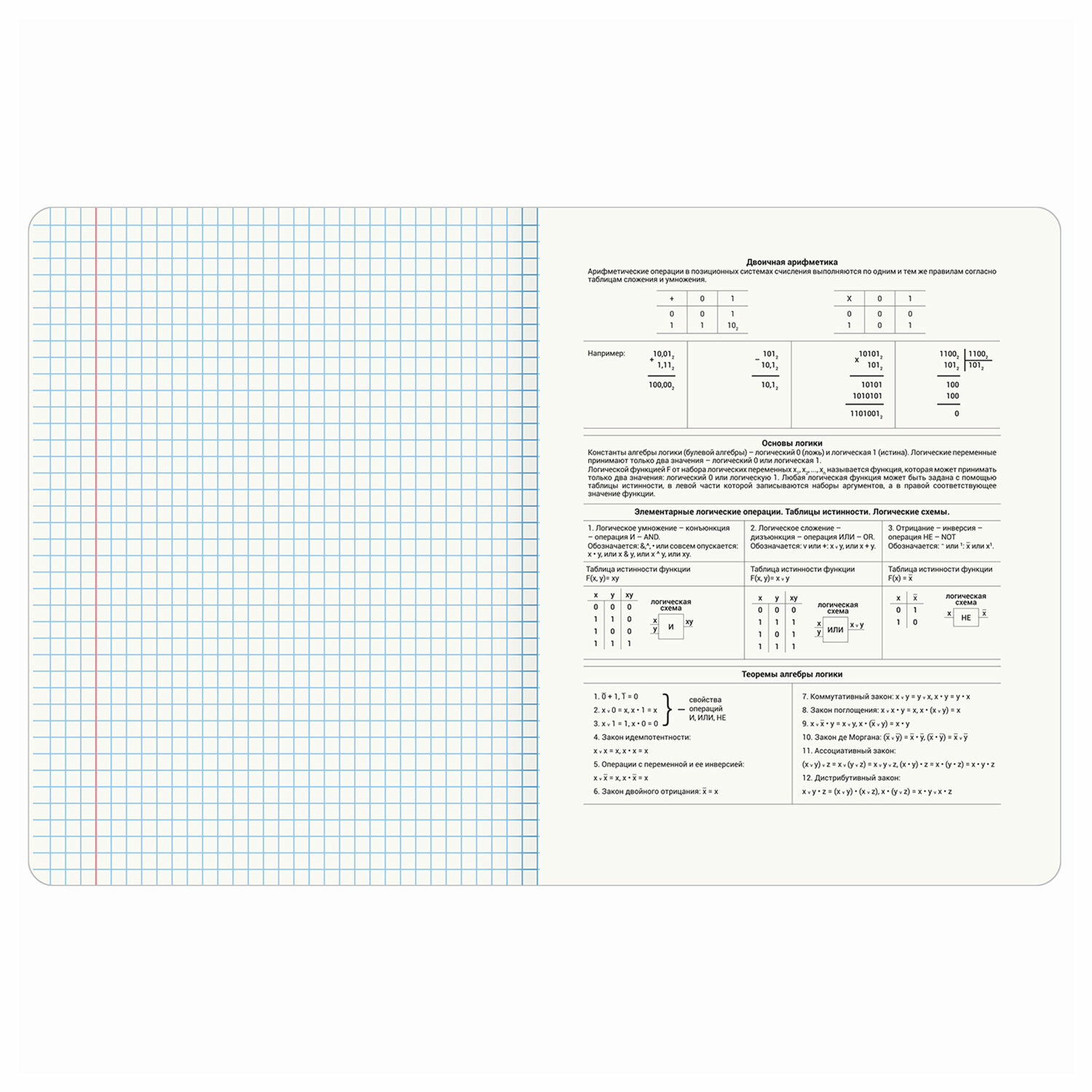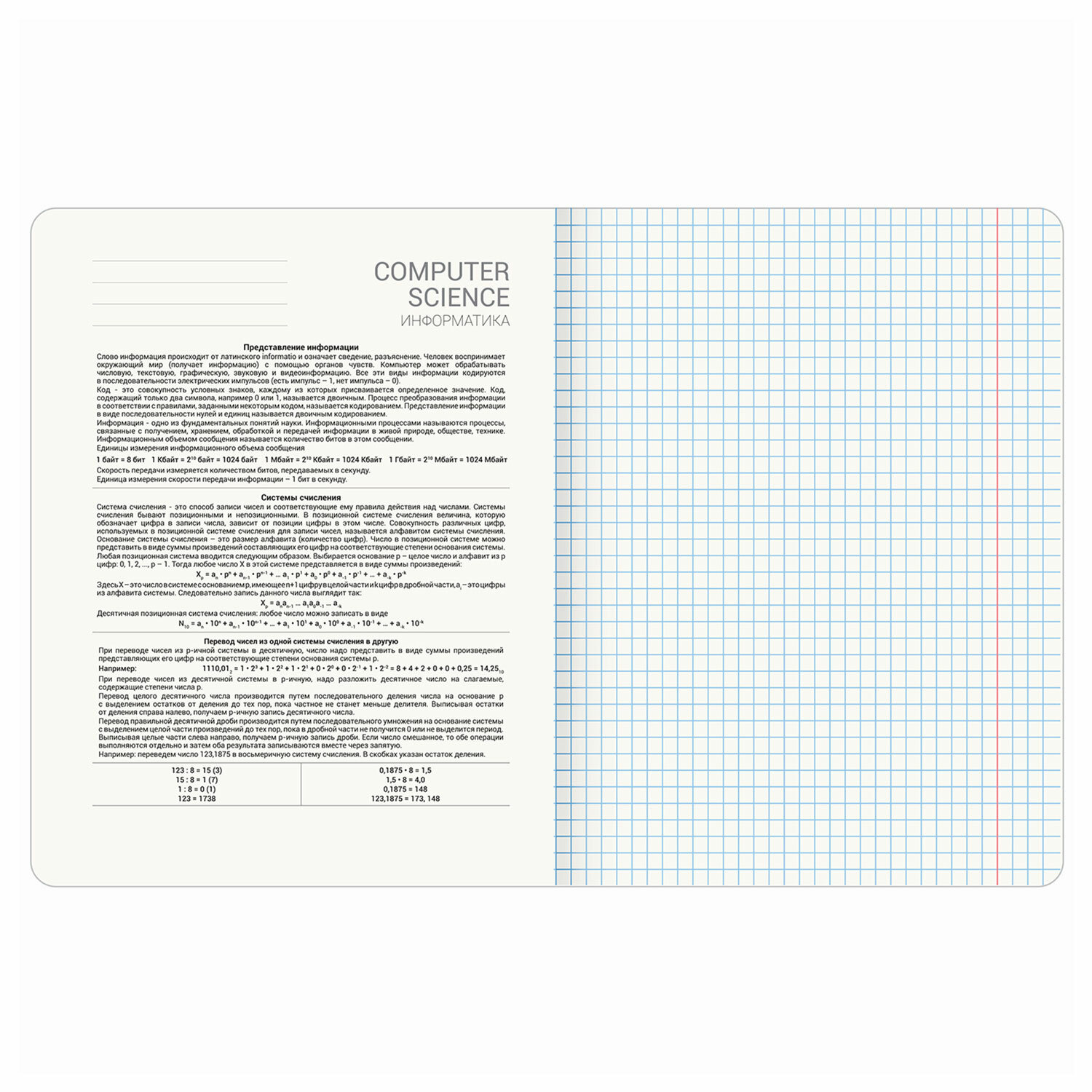 Тетрадь по информатике формата А5 (165х202 мм) содержит 48 листов, изготовленных из высококачественной офсетной бумаги 100% белизны, плотностью 60 г/м2. Листы соединены скобами. Линовка блока - в клетку, красные поля.