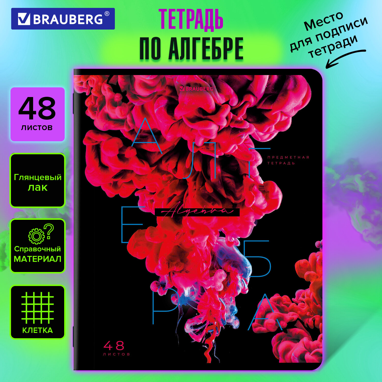 - Тетрадь предметная PIGMENT 48 л., глянцевый УФ-лак, АЛГЕБРА, клетка, подсказ, BRAUBERG, 404758
