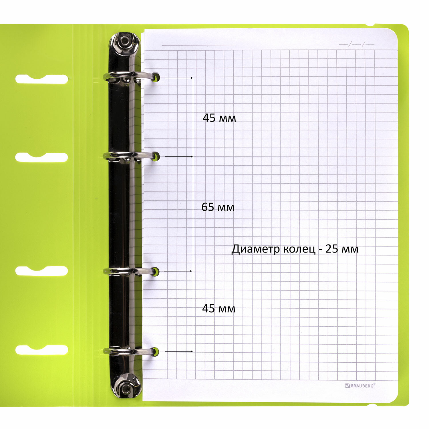 Кольцевой механизм позволяет легко сменить внутренний блок на новый, не покупая при этом новую тетрадь. Диаметр колец составляет 25 мм. Одна такая тетрадь способна заменить несколько небольших тетрадей для разного рода информации, благодаря чему место в сумке расходуется более рационально. Тетрадь на кольцах А5 175х220 мм, 120 л., пластик, с резинкой, BRAUBERG, Салатовый, 404619