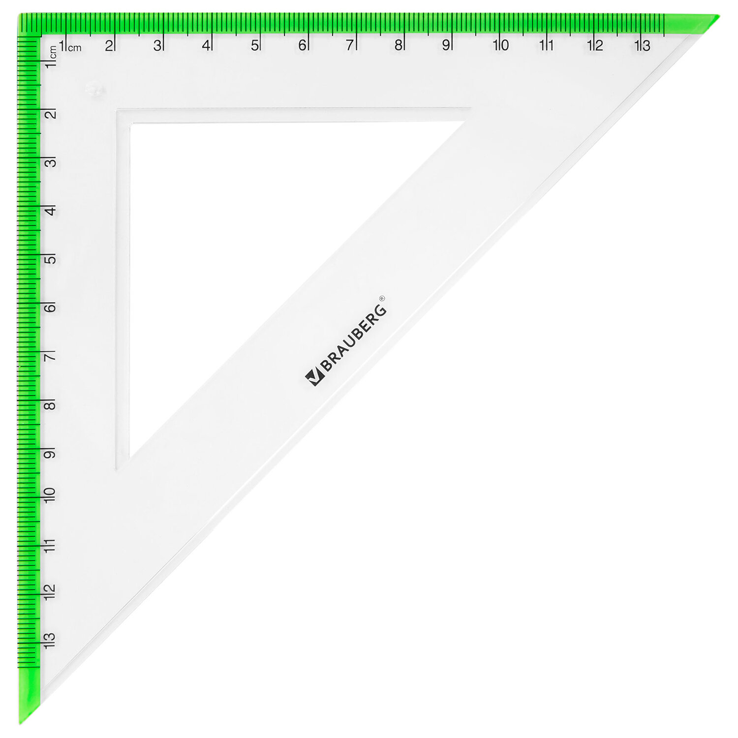- треугольник 45° 13 см. Набор чертежный большой BRAUBERG "FRESH ZONE" (линейка 30 см, 2 треугольника, транспортир) с салатовой шкалой, 210764