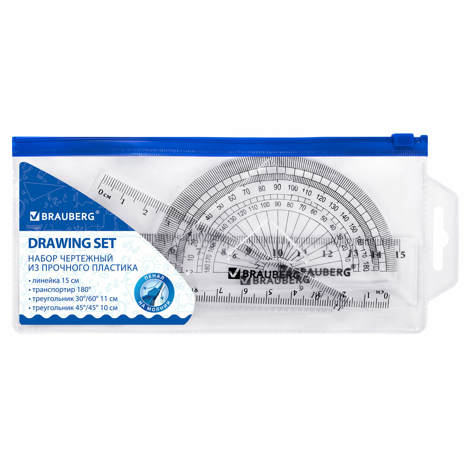 Изготовлен из прочного прозрачного пластика толщиной 1,4-2 мм. Поставляется в пенале на молнии с европодвесом. Набор чертежный малый BRAUBERG (линейка 15 см, 2 угольника, транспортир), конверт на молнии, 210306