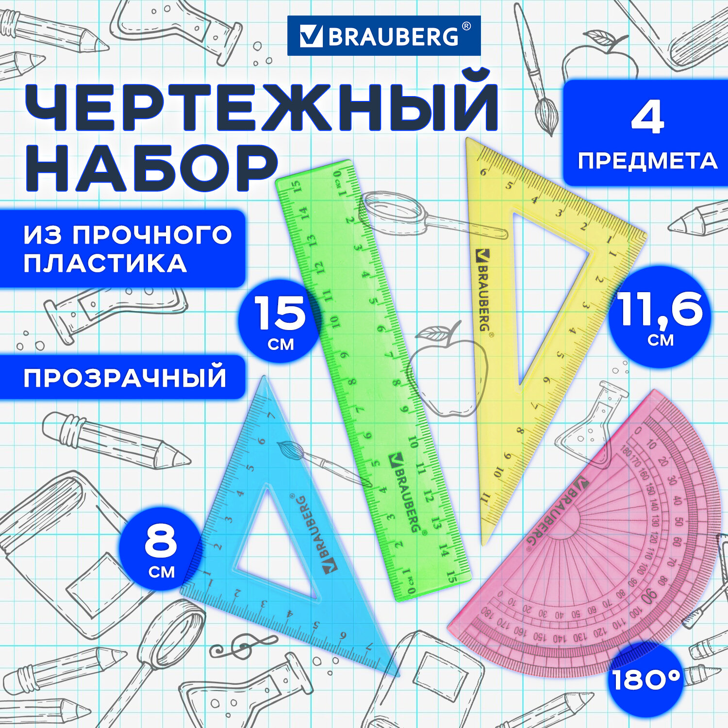 - Набор чертежный малый BRAUBERG "Crystal" (линейка 15 см, 2 угольника, транспортир), цветной, 210295