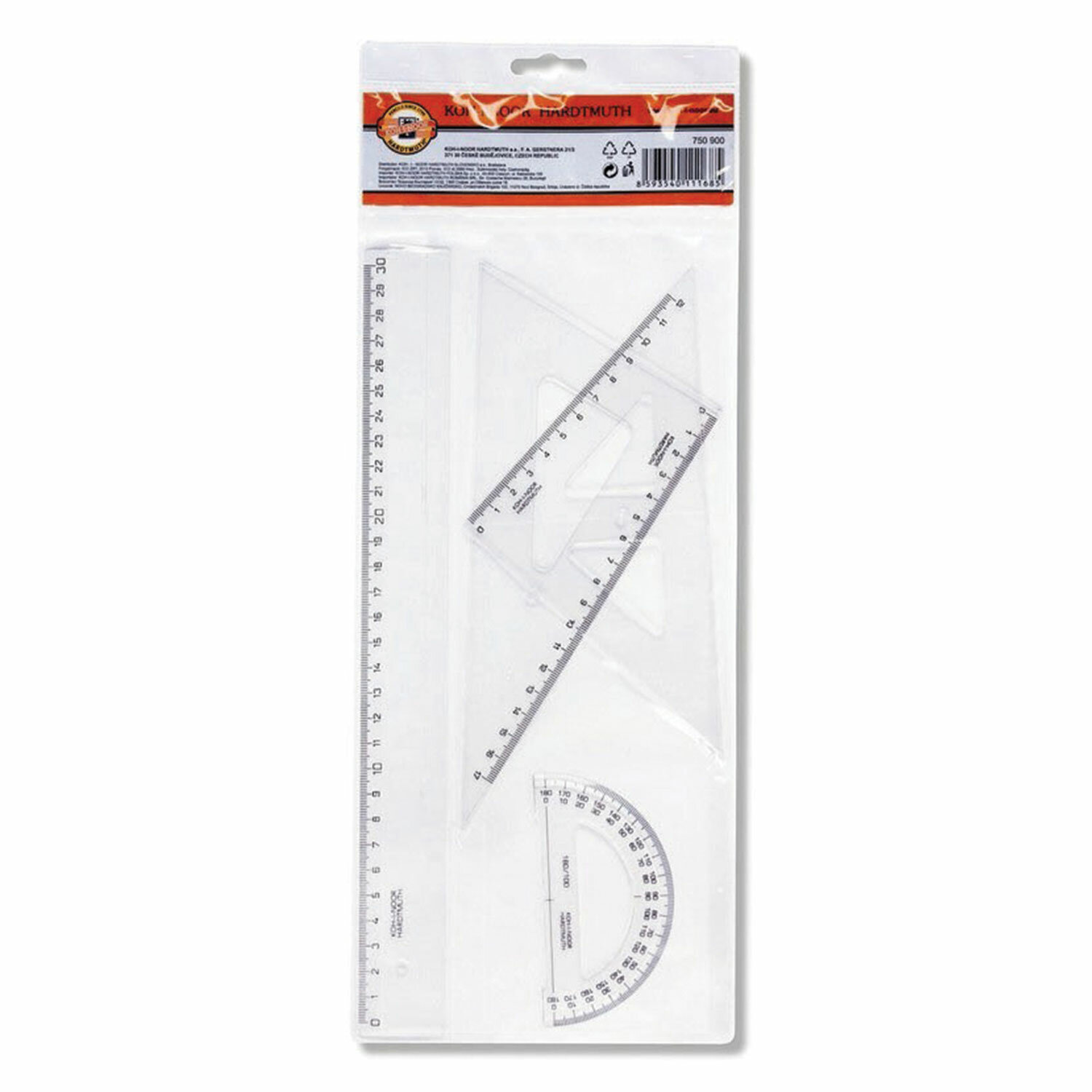 Набор чертежный средний KOH-I-NOOR (линейка 30 см, 2 треугольника, транспортир), прозрачный, европодвес, 750900, 75090000000
