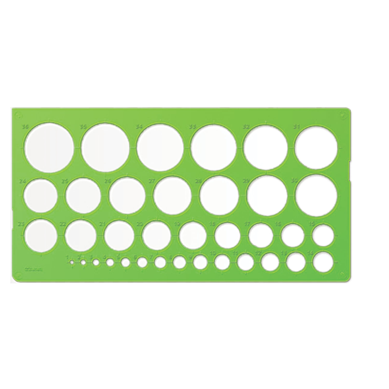 - Трафарет окружностей, 36 элементов диаметром от 1 до 36 мм, зеленого цвета, ТТ21