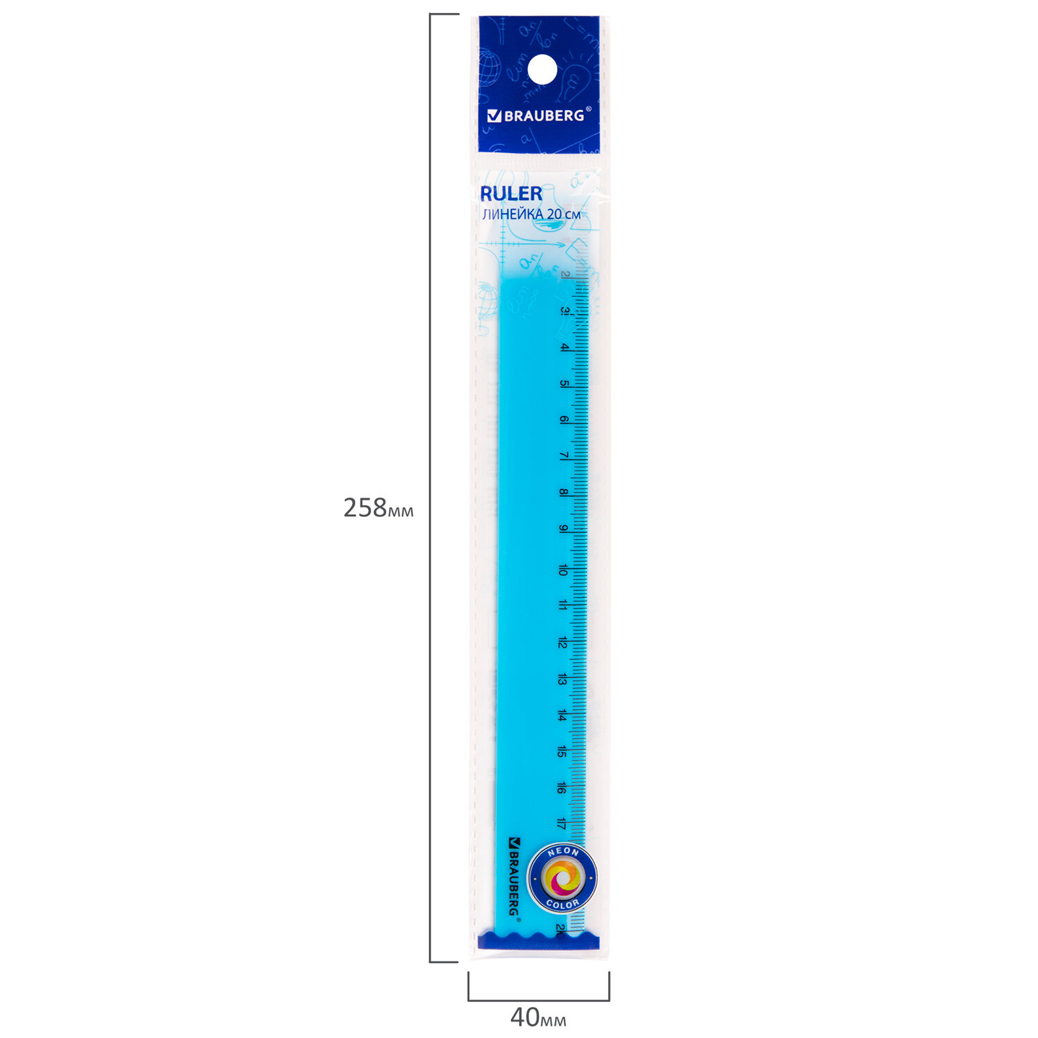 - Линейка пластиковая 20 см, BRAUBERG "NEON", ассорти, пакет, 210773