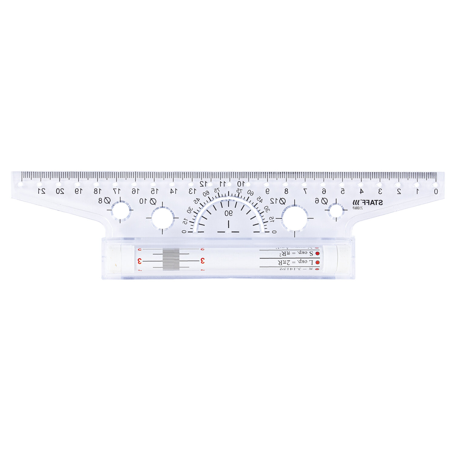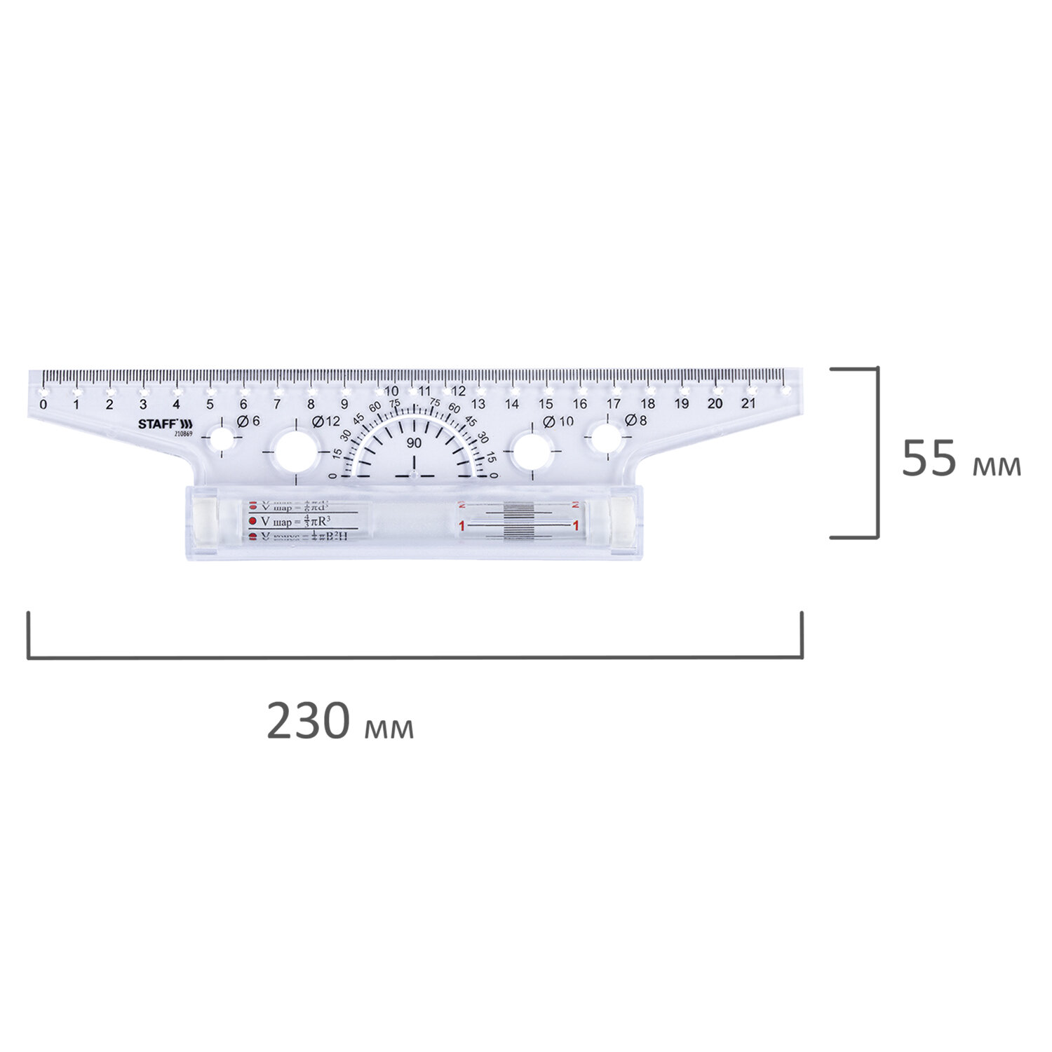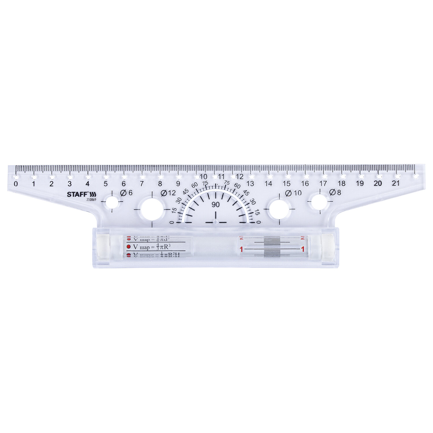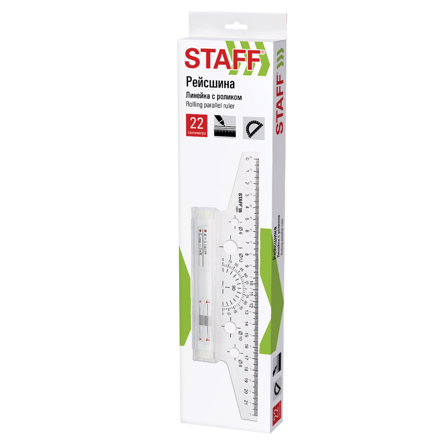 Изготовлена из высокопрочного пластика. Оснащена металлическим антискользящим роликом, на котором изображена измерительная шкала и геометрические формулы. Длина шкалы составляет 22 см. На линейку нанесена измерительная шкала и шкала транспортира. Также снабжена трафаретом окружностей различных диаметров. На ролике нанесена дополнительная шкала и геометрические формулы. Линейка с роликом (рейсшина) 22 см, металлический ролик, картонная коробка, STAFF, 210869