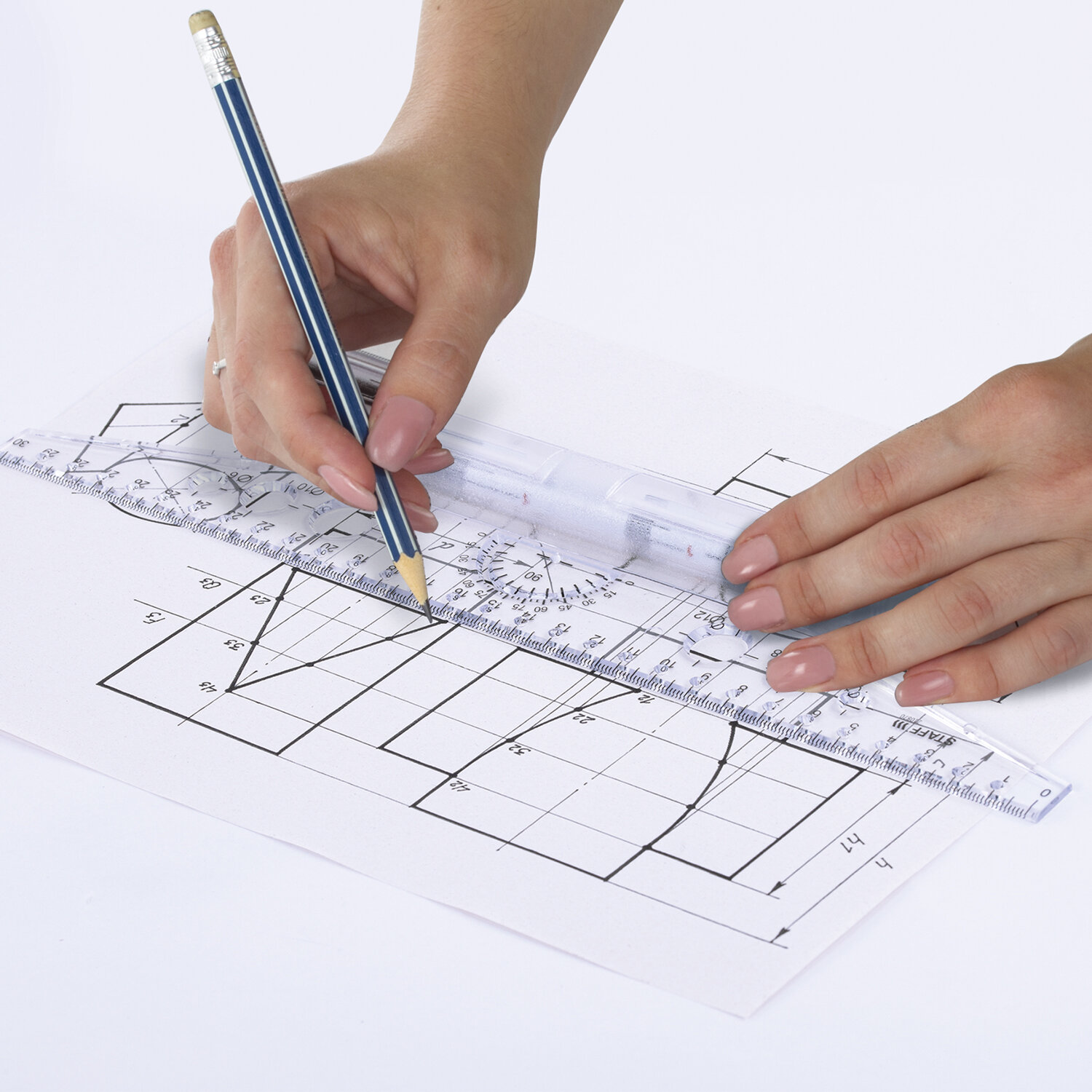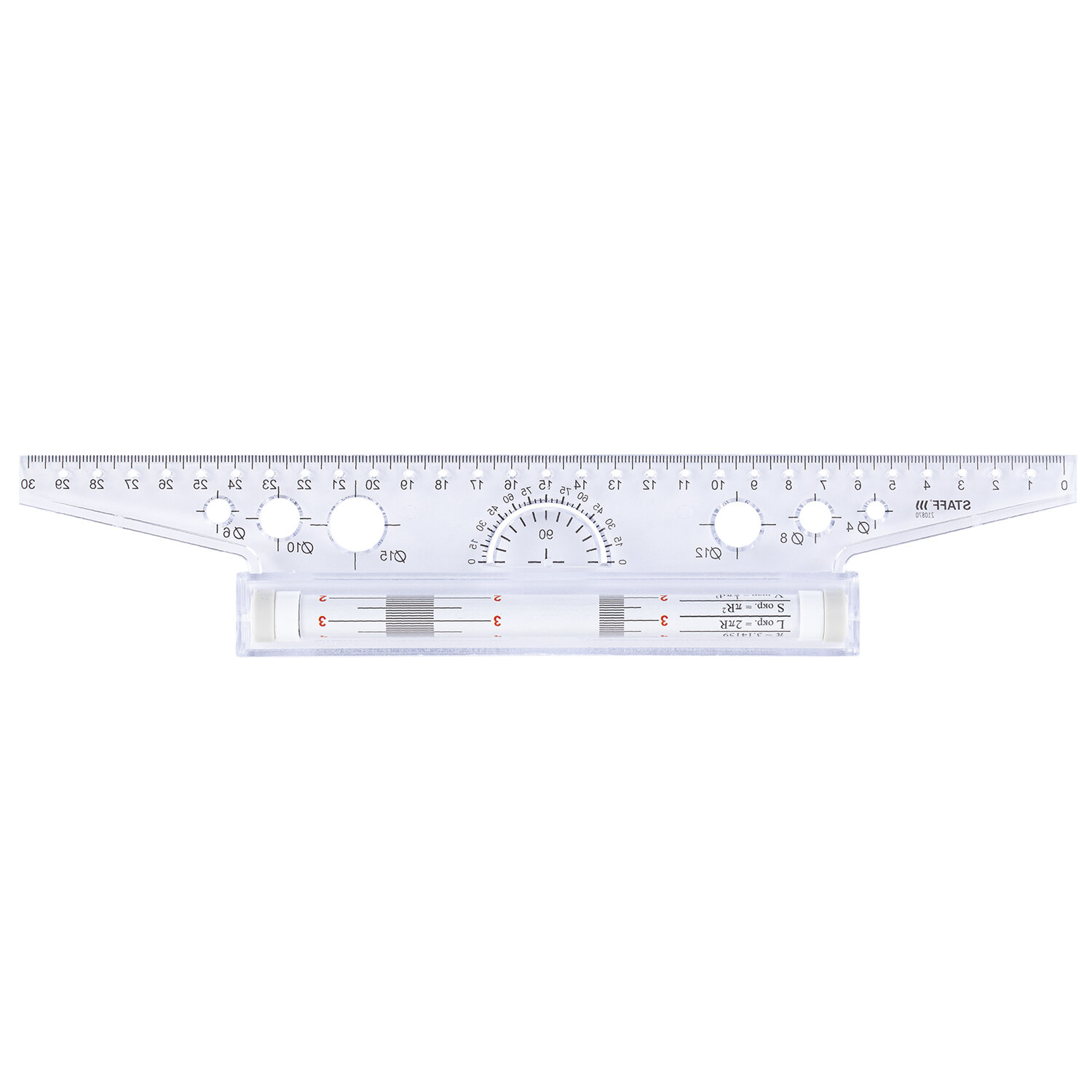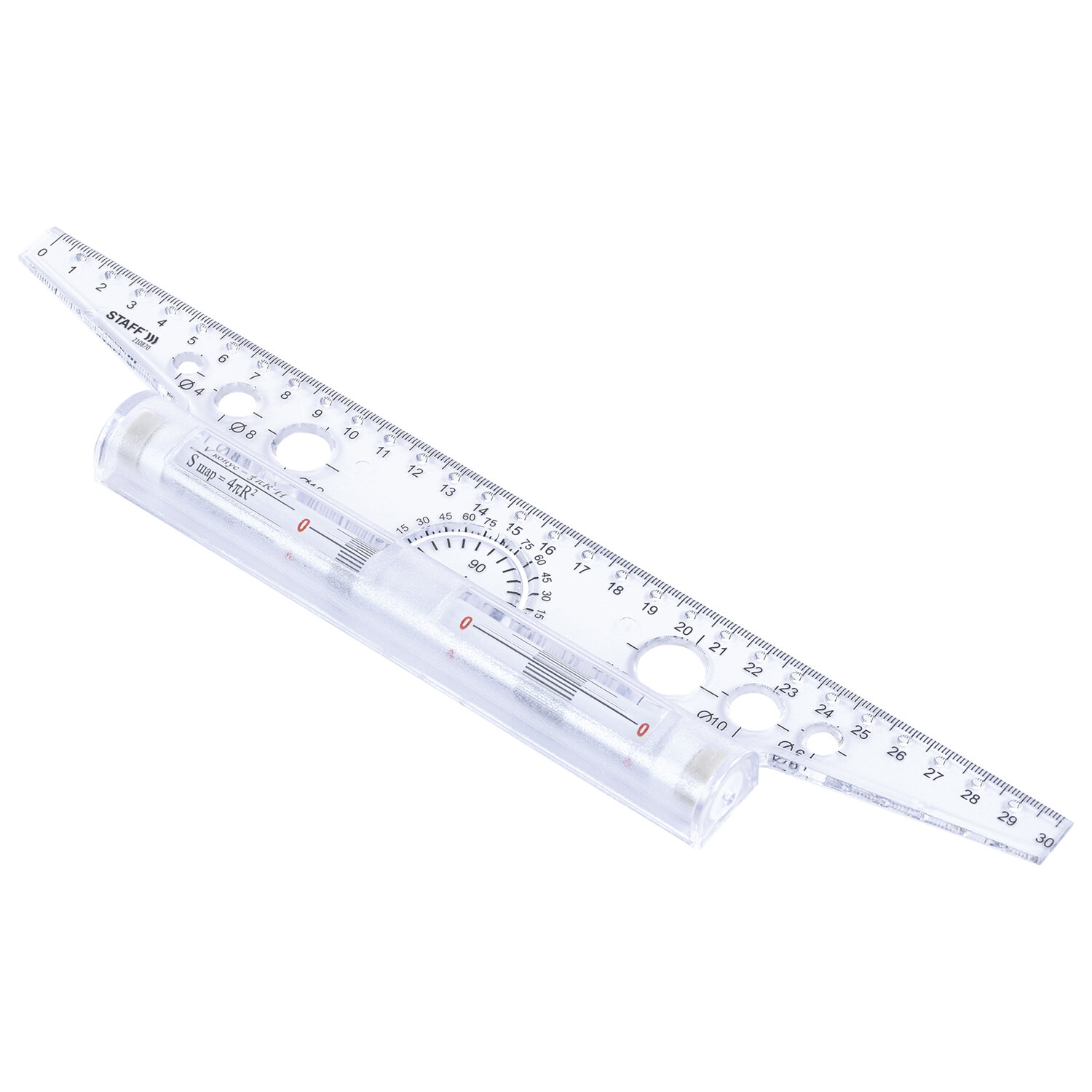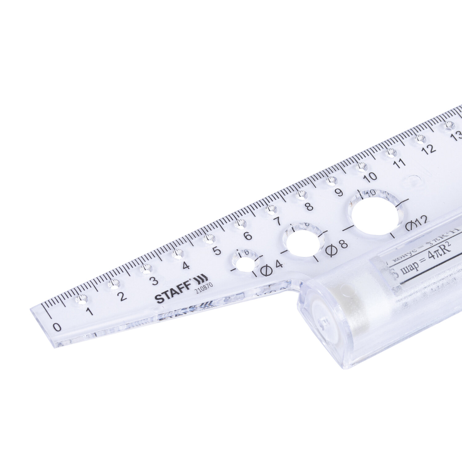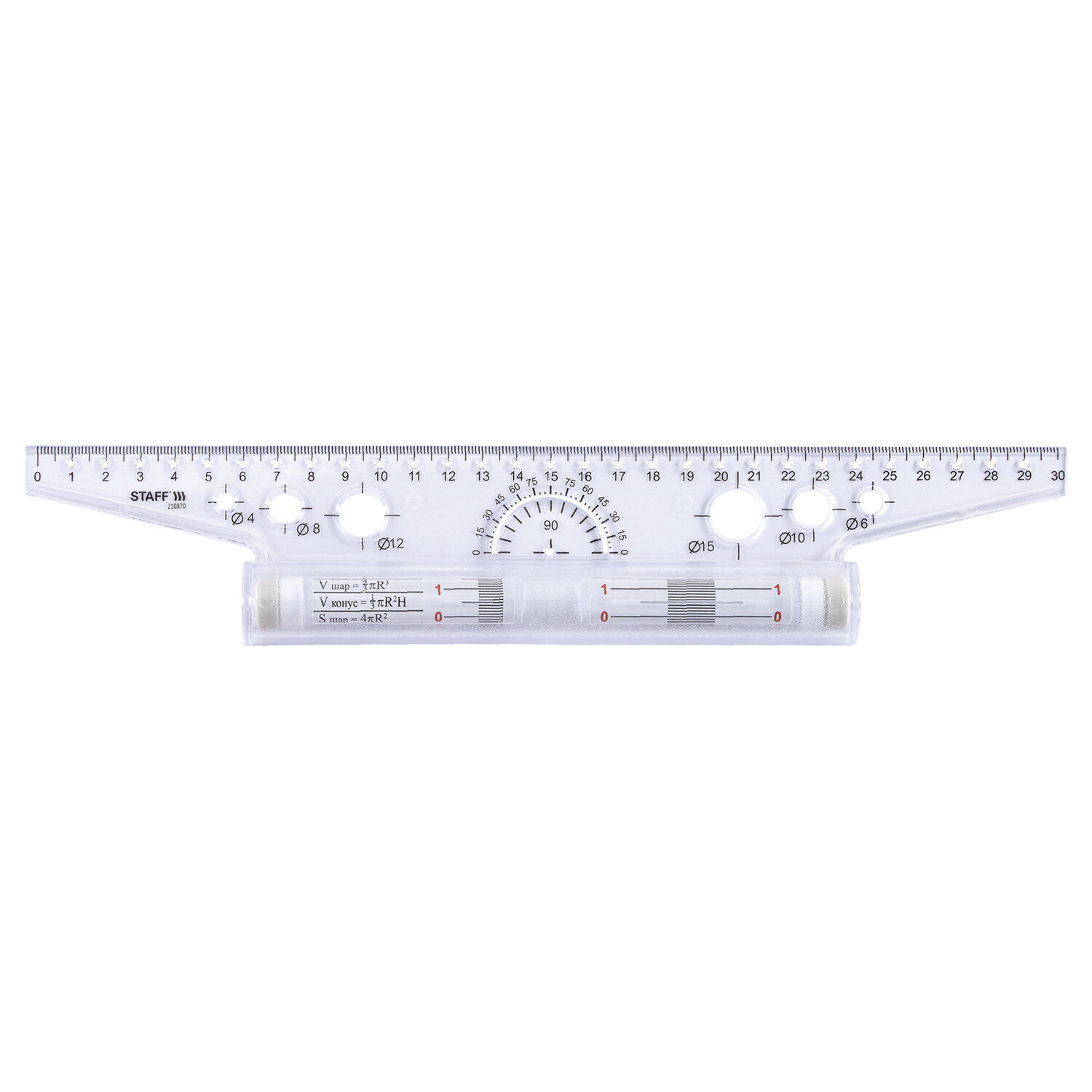 Изготовлена из высокопрочного пластика. Оснащена металлическим антискользящим роликом, на котором изображена измерительная шкала и геометрические формулы. Длина шкалы составляет 30 см. На линейку нанесена измерительная шкала и шкала транспортира. Также снабжена трафаретом окружностей различных диаметров. На ролике нанесена дополнительная шкала и геометрические формулы. Линейка с роликом (рейсшина) 30 см, металлический ролик, картонная коробка, STAFF, 210870