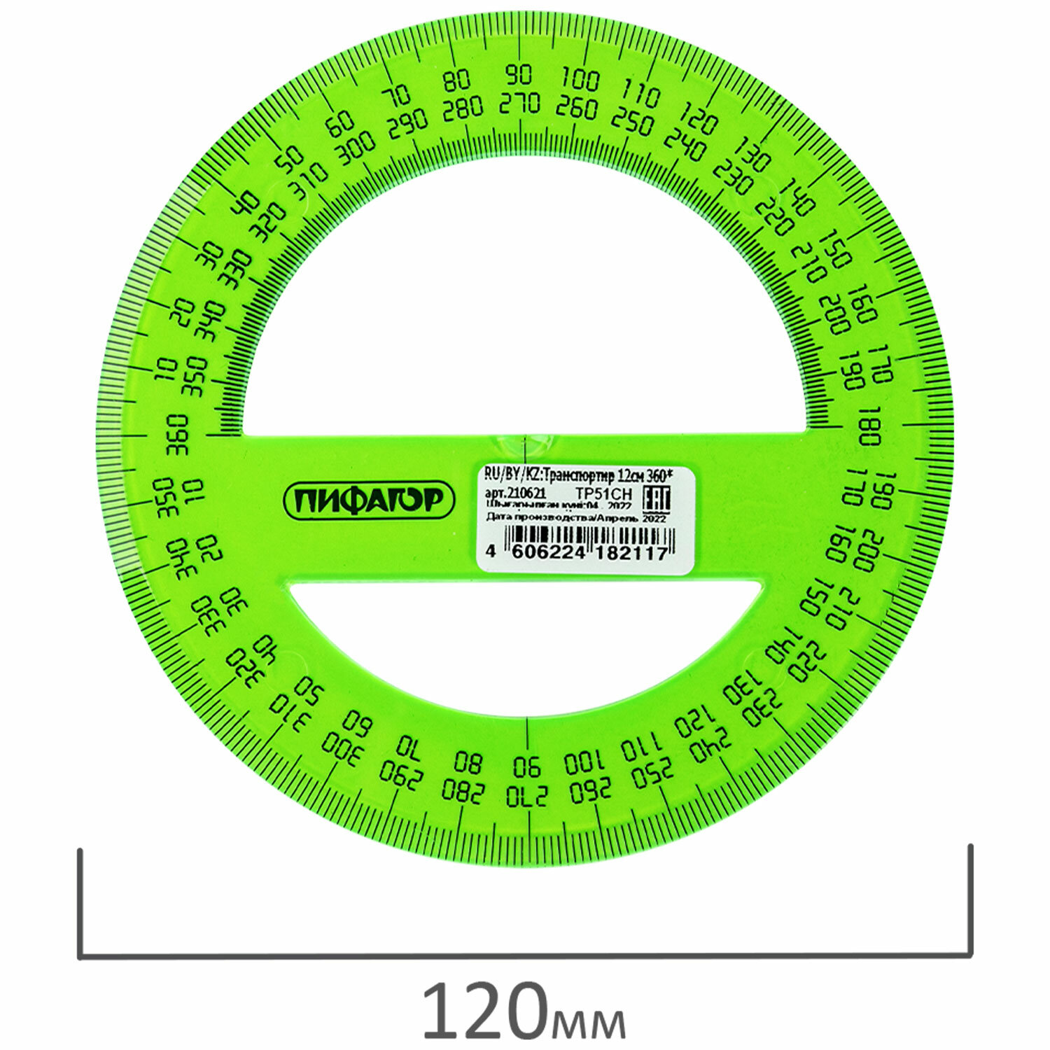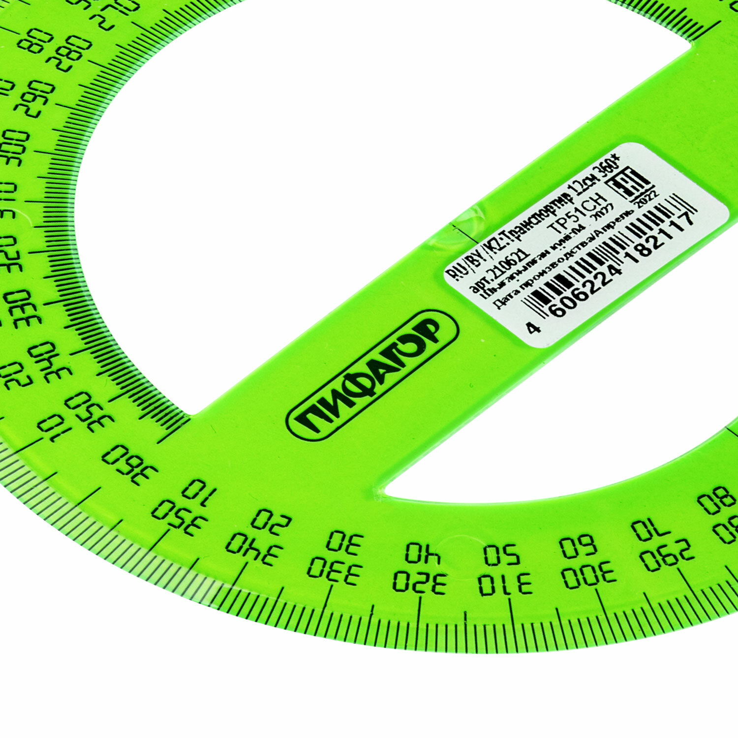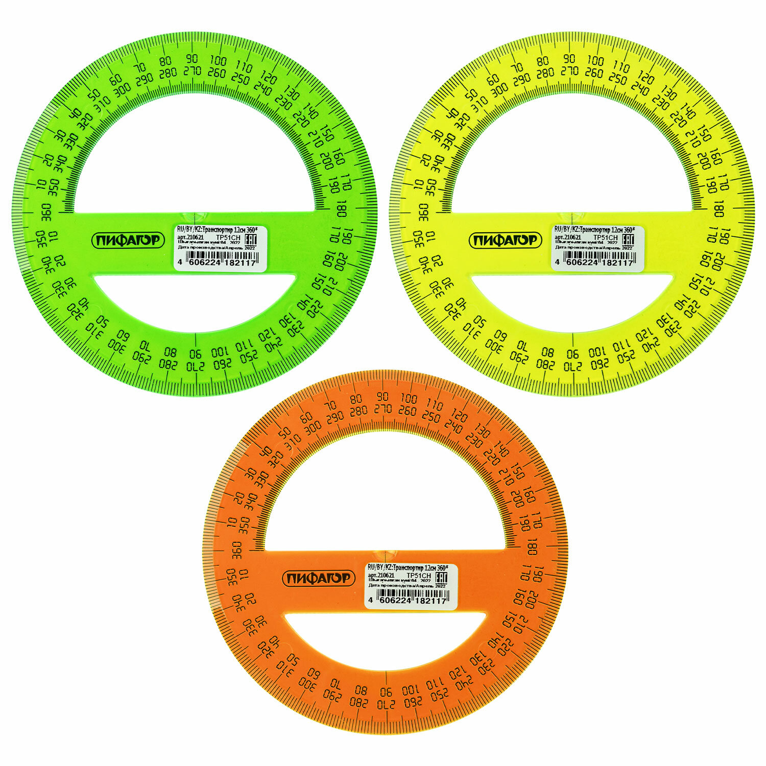 - Транспортир 12 см, 360 градусов, ПИФАГОР, прозрачный, неоновый, ассорти, 210621