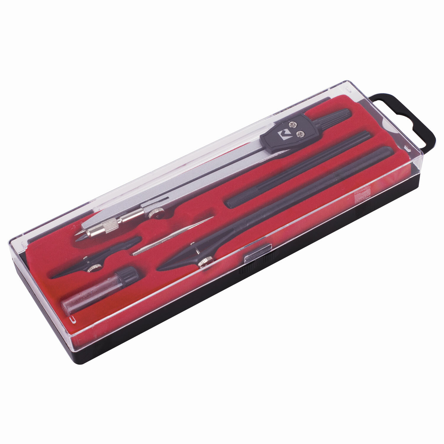 - Готовальня BRAUBERG "Architect", 6 предметов: циркуль, рейсфедер + вставка + держатель, игольная вставка, грифель, 210342