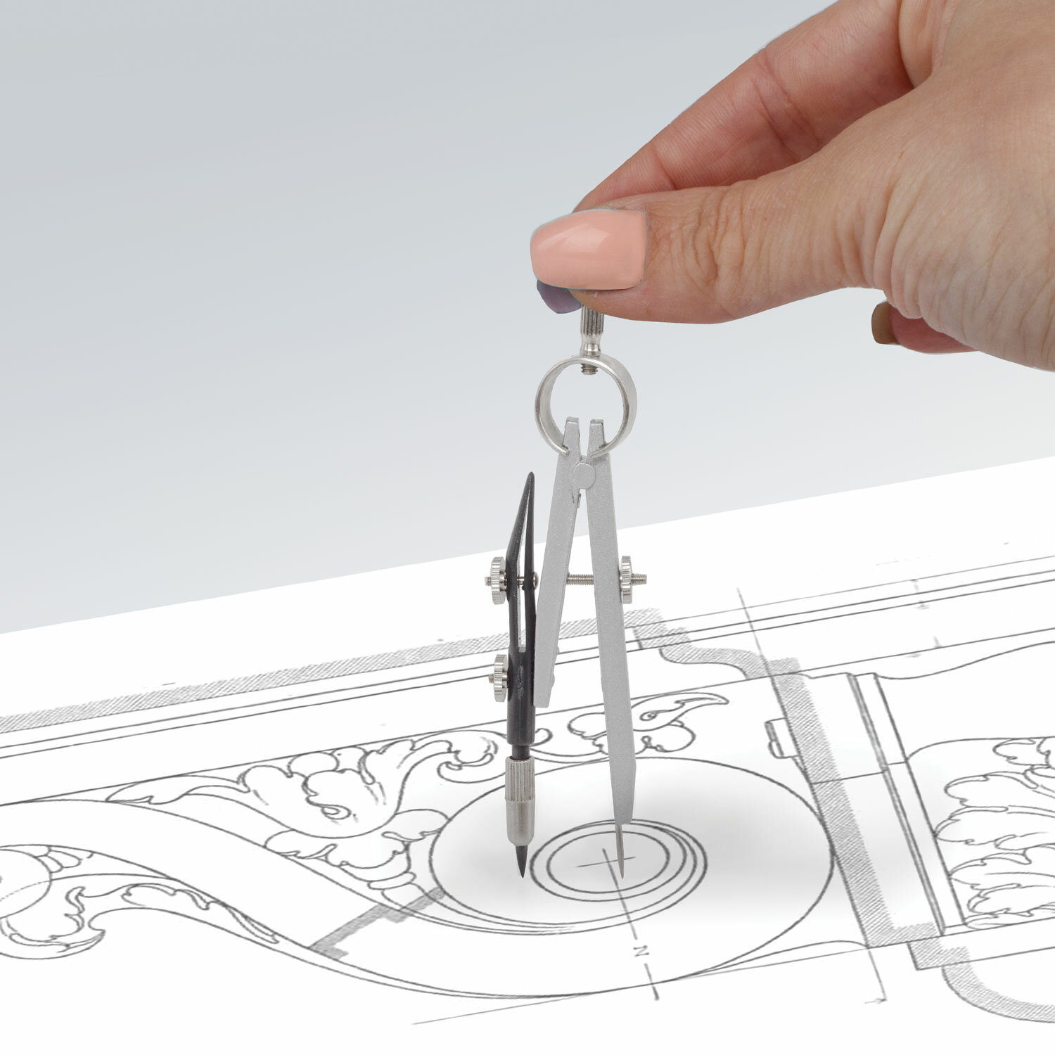 Циркуль длиной 135 мм имеет несгибаемые штанги. Изготовлен из металла, дополнительный цвет элементов – черный.