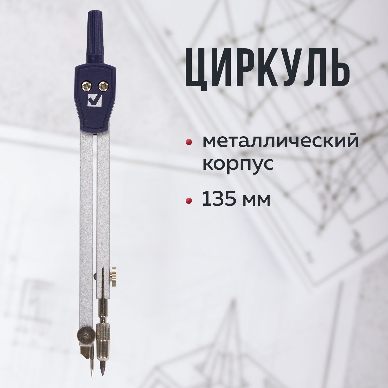 Инструмент длиной 135 мм имеет несгибаемые штанги. Изготовлен из металла, дополнительный цвет - синий. Поставляется в чехле из ПВХ с европодвесом. Циркуль BRAUBERG "Architect", 135 мм, подстраиваемая игла, чехол, 210315