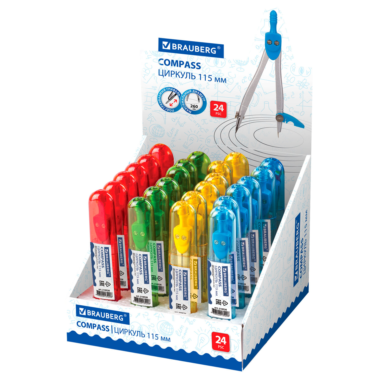- Циркуль BRAUBERG "Klasse", 115 мм, пластиковый пенал, ассорти, дисплей, 210526