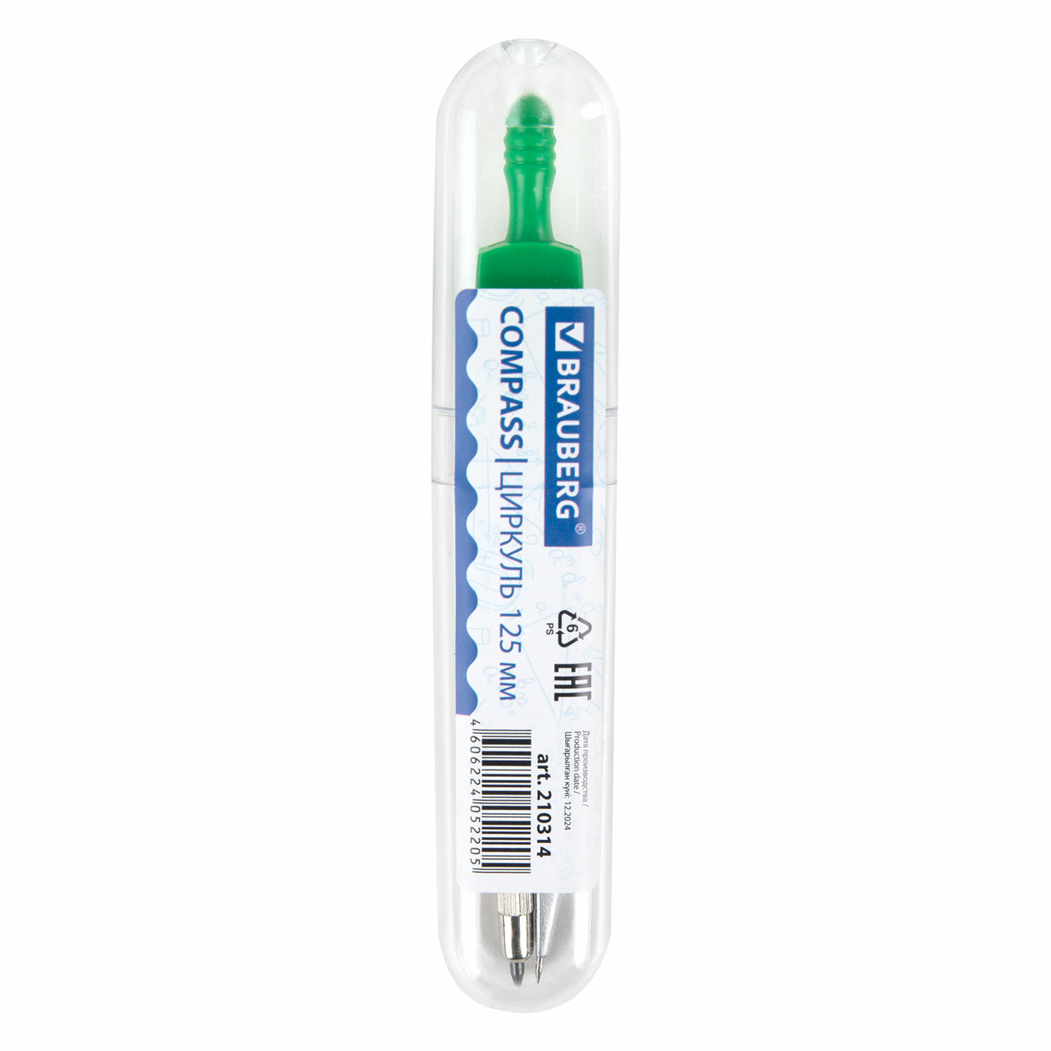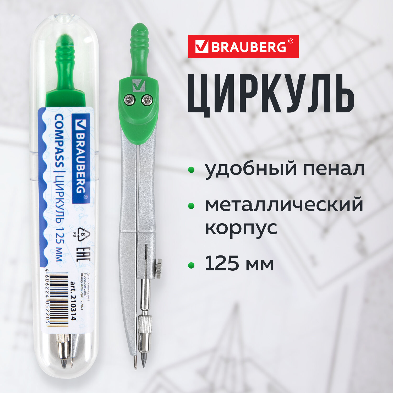 - Циркуль BRAUBERG "Klasse", 125 мм, туба, классный, 210314