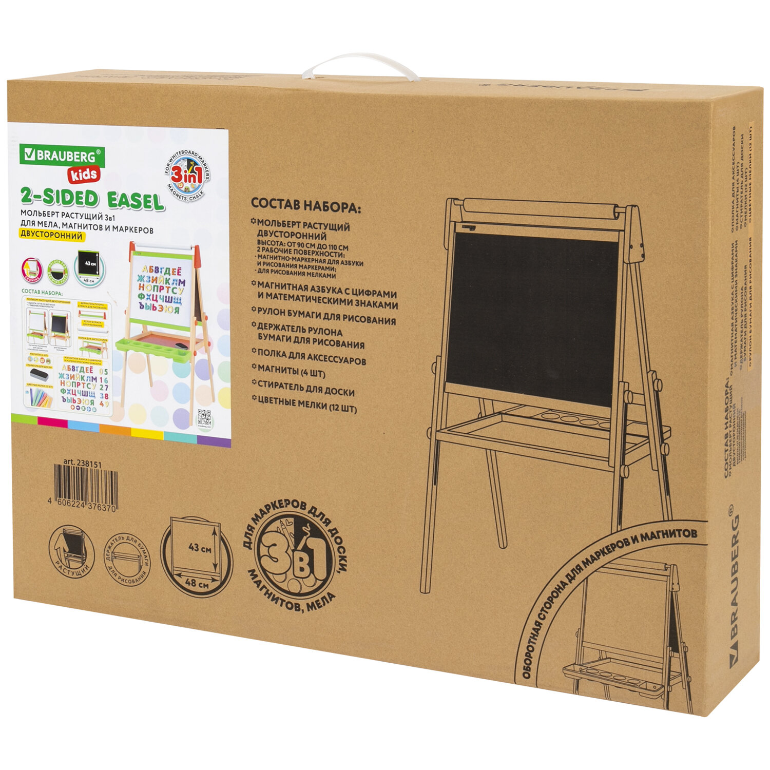 Рекомендации по уходу: для сохранения меловой поверхности мольберта мы рекомендуем использовать мягкие мелки для меловых досок. В случае использования твердых мелков необходимо смочить кончик мела водой перед первым использованием. Не забывайте давать меловой поверхности высыхать перед следующим применением! Для магнитно-маркерной поверхности мольберта необходимо использовать только маркеры для белой доски. Перед первым использованием удалите защитную пленку с поверхности магнитной доски. Мольберт растущий 3 в 1 для мела/магнитно-маркерный 48х43 см, BRAUBERG KIDS, 238151