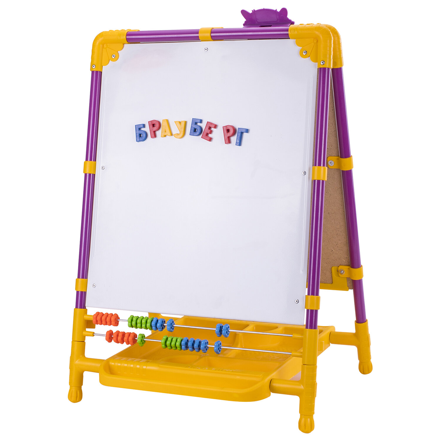 Поверхность мольберта белого цвета предназначена для рисования специальным маркером для белой доски, а также для размещения магнитов; черная поверхность - для рисования мелками. Для детей старше 3-х лет. Регулируется по высоте от 73,5 до 107,5 см для удобства использования детьми разного возраста и роста. Размер рабочей поверхности: 53х46 см. Цвет: сиреневый.