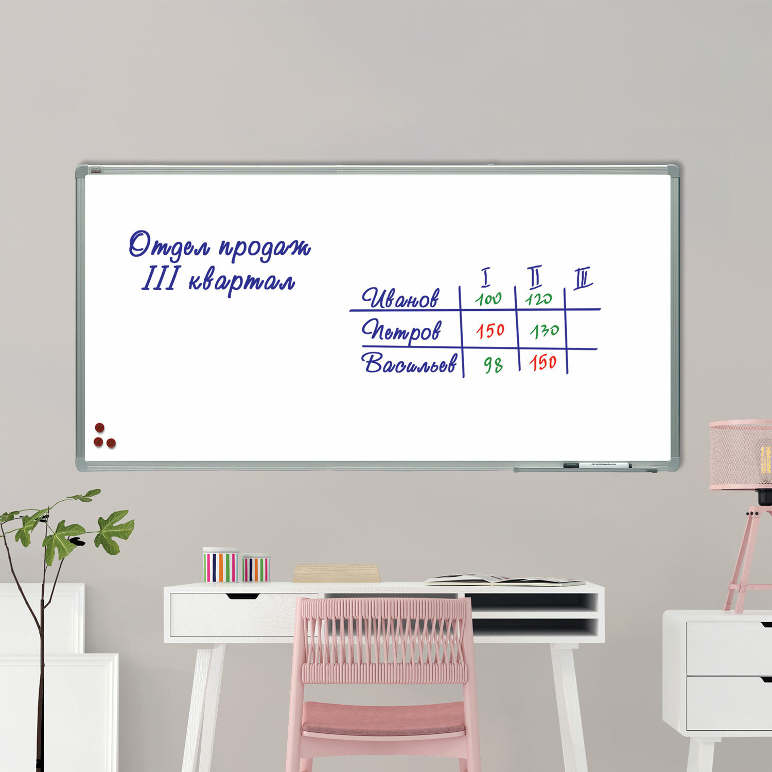 Лаковое покрытие предназначено для письма специальными маркерами для белой доски, а металлическая поверхность позволяет размещать информацию при помощи магнитов. Доска имеет укрепленные пластиковые уголки, которые позволяют скрыть места крепления к стене. Размер - 120х240 см. Профиль придает изделию дополнительную прочность и современный стильный внешний вид. Полочка для аксессуаров и элементы крепления входят в комплект. При должном уходе за рабочей поверхностью доски при помощи чистящей жидкости-спрея и стирателей t;2х3t; поверхность магнитно-маркерной доски прослужит более 10 лет.
