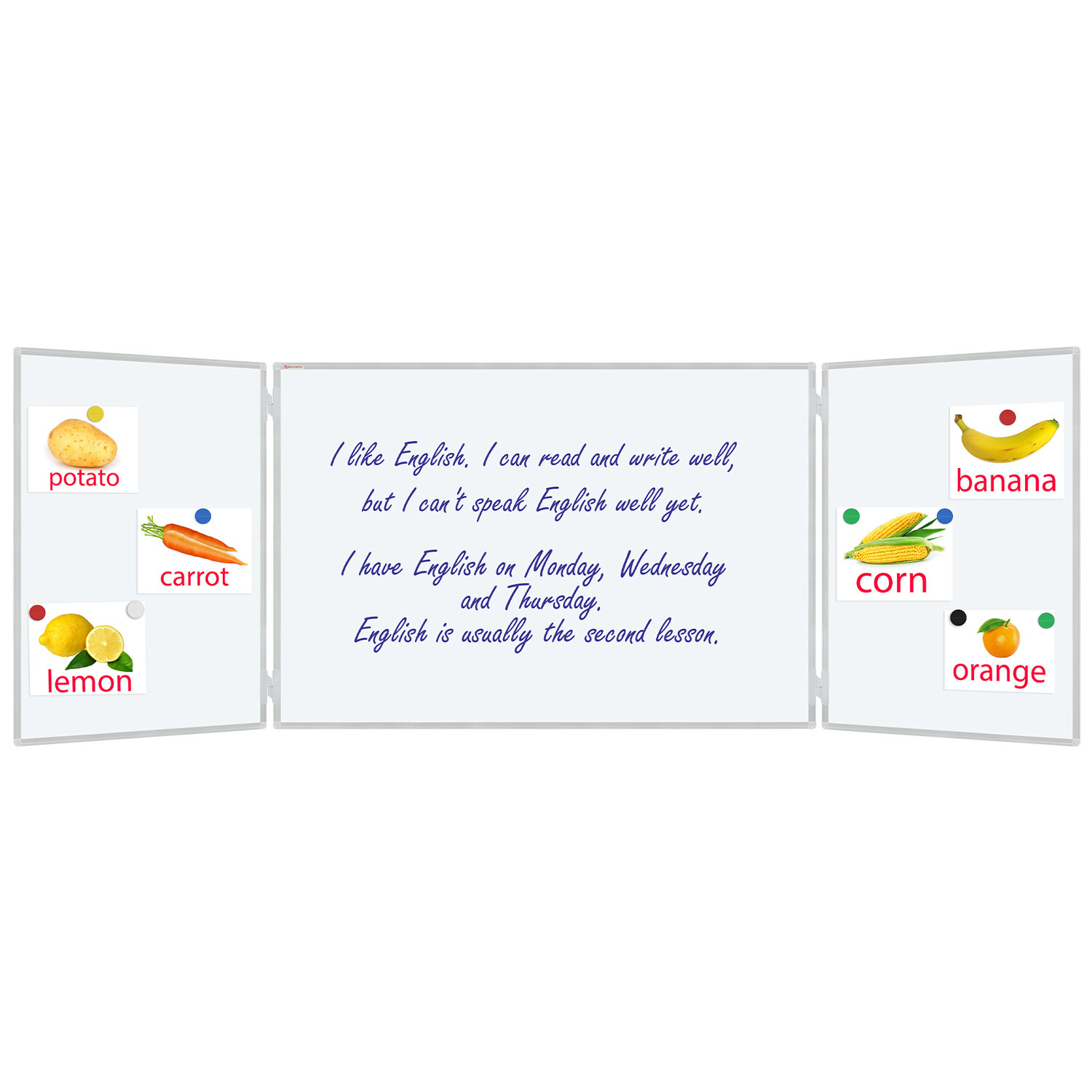 Трехэлементная магнитно-маркерная доска белого цвета имеет центральную одностороннюю секцию размером 100х150 см и две боковые секции - 100х75 см каждая.