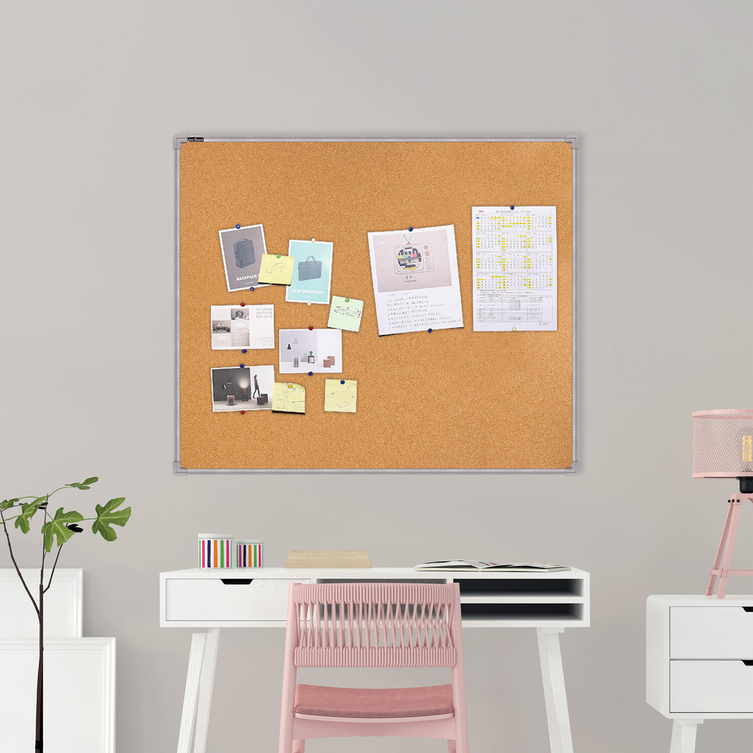 Пробковая поверхность доски позволяет легко прикреплять информацию (листы бумаги, карты и т.п.) с помощью булавок, кнопок, флажков и т. п. После каждого изъятия кнопки из поверхности, пробка принимает первоначальный вид. Доска пробковая для объявлений 100х120 см, металлическая рамка, BS, П-120, П*120