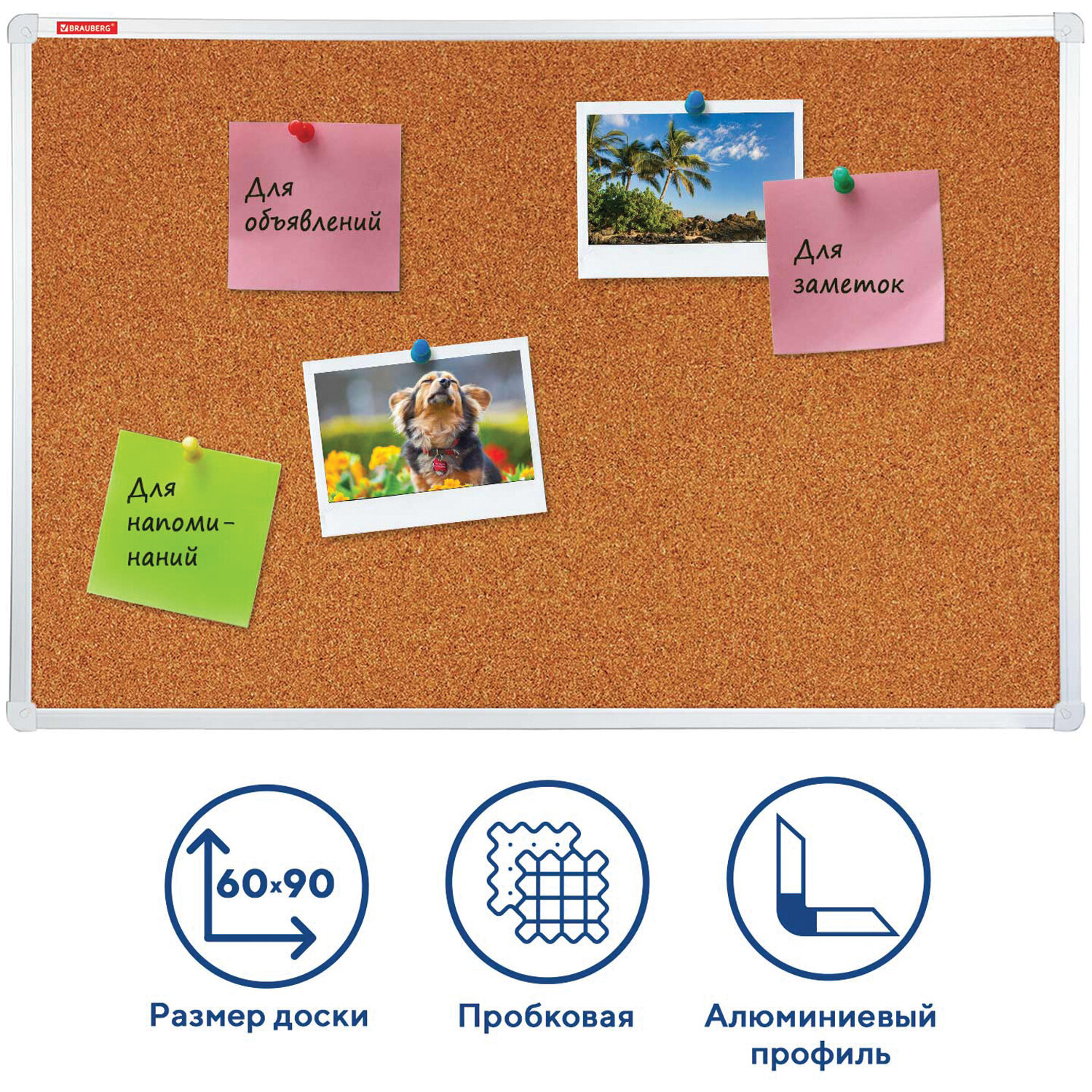 - Доска пробковая для объявлений 60х90 см, алюминиевая рамка, ГАРАНТИЯ 10 ЛЕТ, РОССИЯ, BRAUBERG, 231712