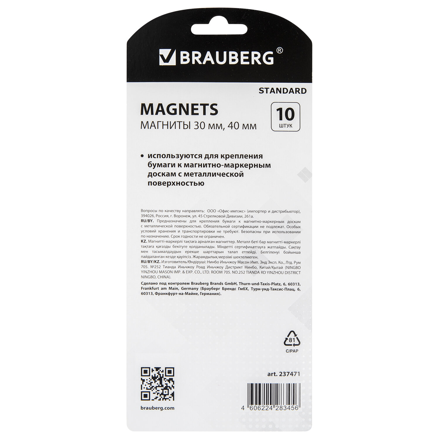 - Магниты BRAUBERG "STANDARD", НАБОР 30 мм - 6 шт., 40 мм - 4 шт., ассорти, 237471