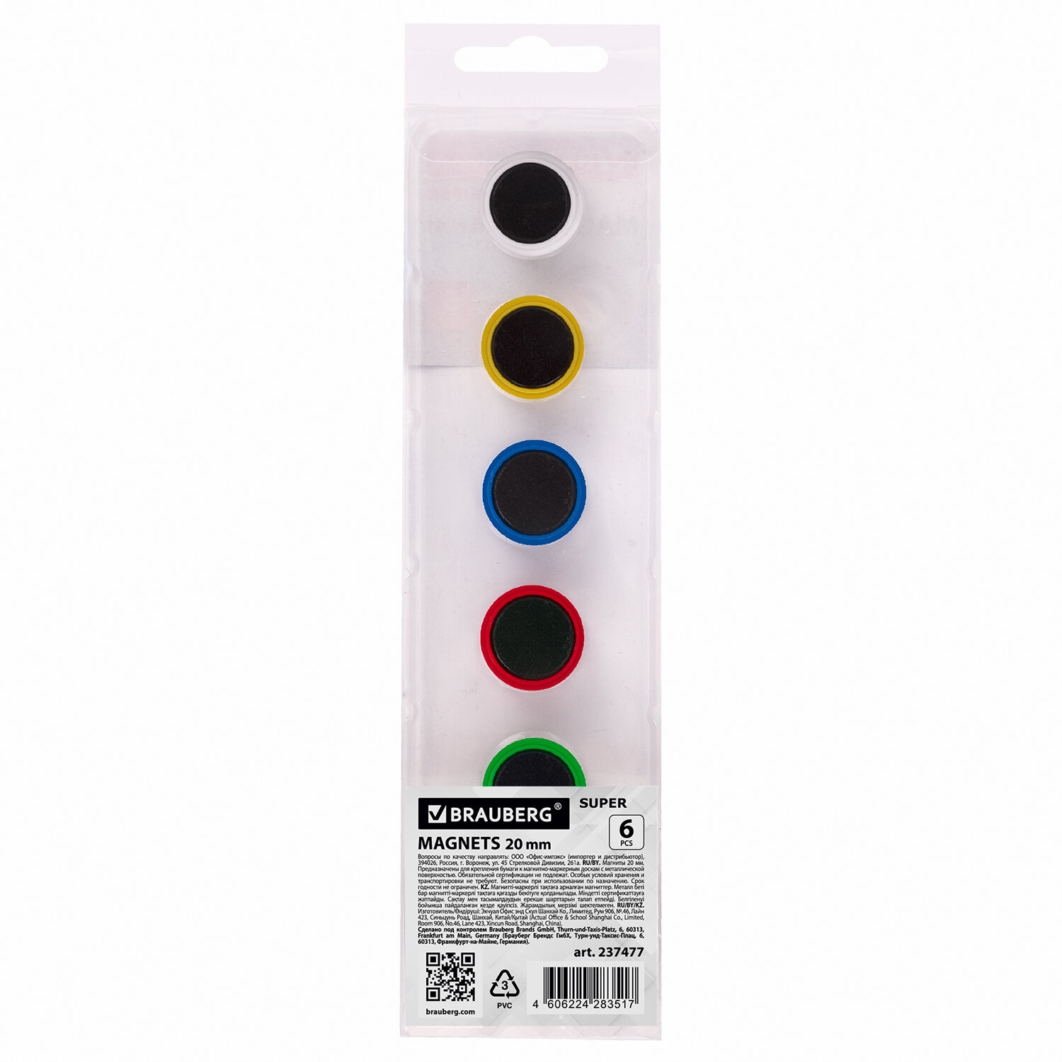 - Магниты МОЩНЫЕ 20 мм (МАЛОГО ДИАМЕТРА), НАБОР 6 шт., ассорти, BRAUBERG "SUPER", 237477