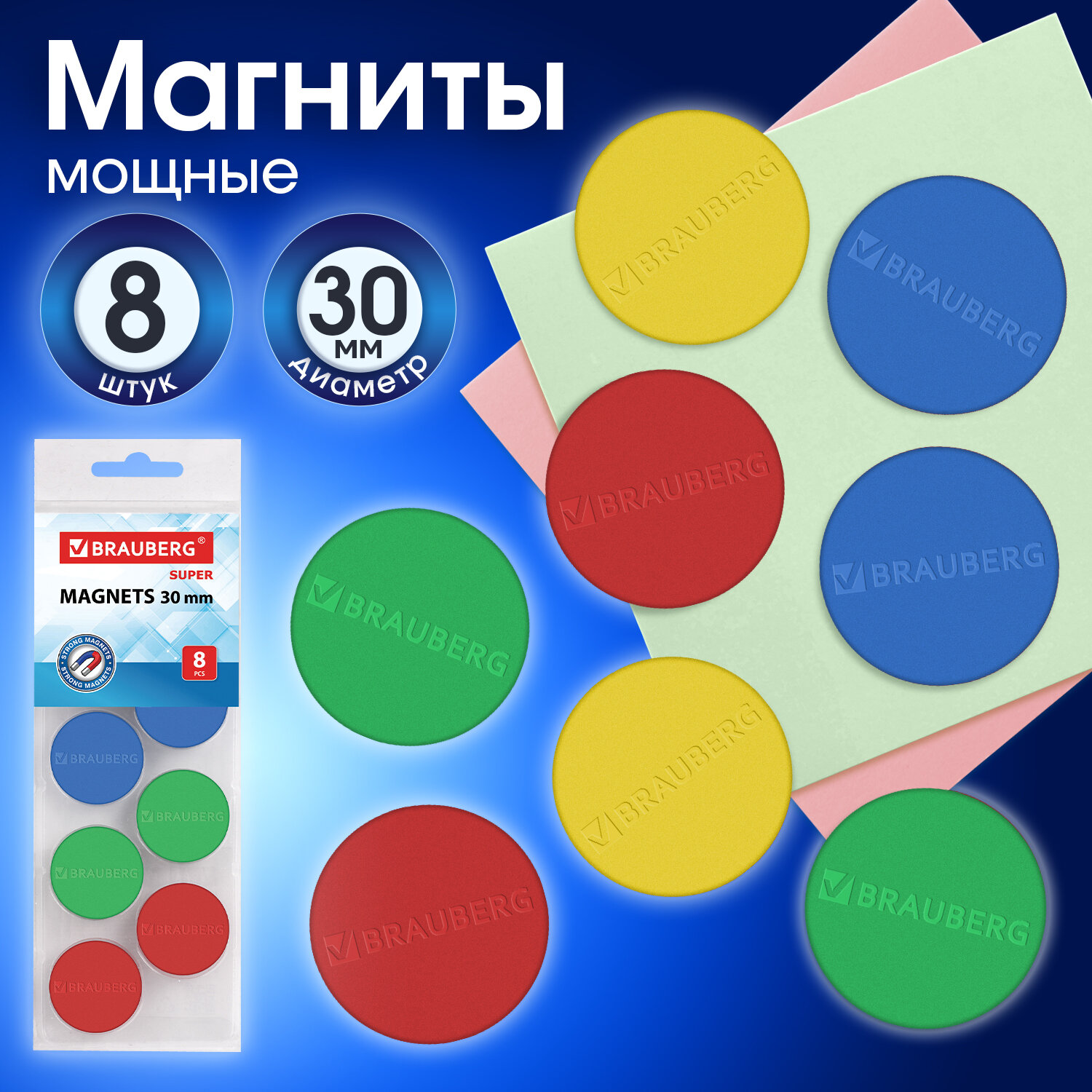 - Магниты МОЩНЫЕ 30 мм, НАБОР 8 шт., ассорти, BRAUBERG "SUPER", 237479