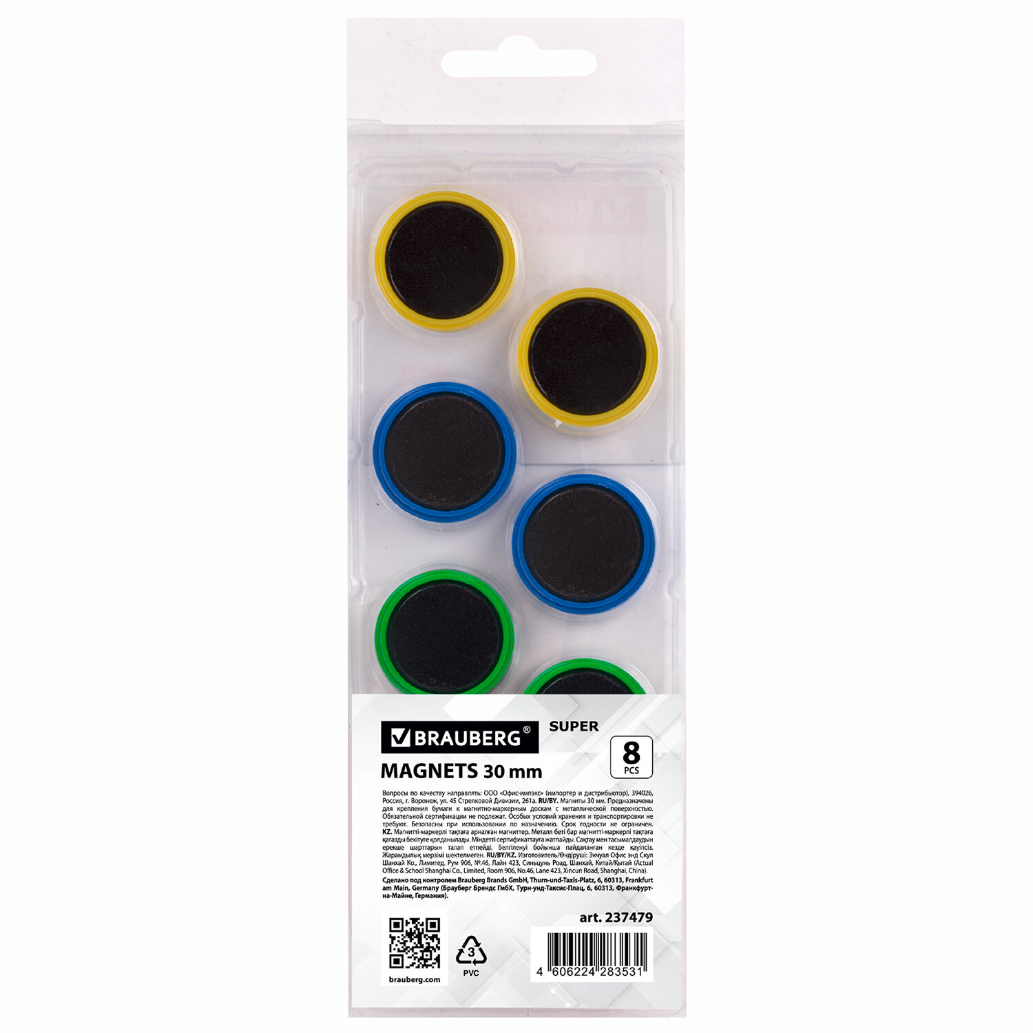 Диаметр магнитов составляет 30 мм. 8 штук в комплекте. Надежно удерживаются на любой железной или стальной поверхности. Магниты BRAUBERG t;SUPERt; отличаются повышенной удерживающей магнитной силой. Магниты круглой формы выполнены из пластика цветов ассорти. Поставляются в прозрачном пластиковом боксе с европодвесом. Магниты МОЩНЫЕ 30 мм, НАБОР 8 шт., ассорти, BRAUBERG "SUPER", 237479
