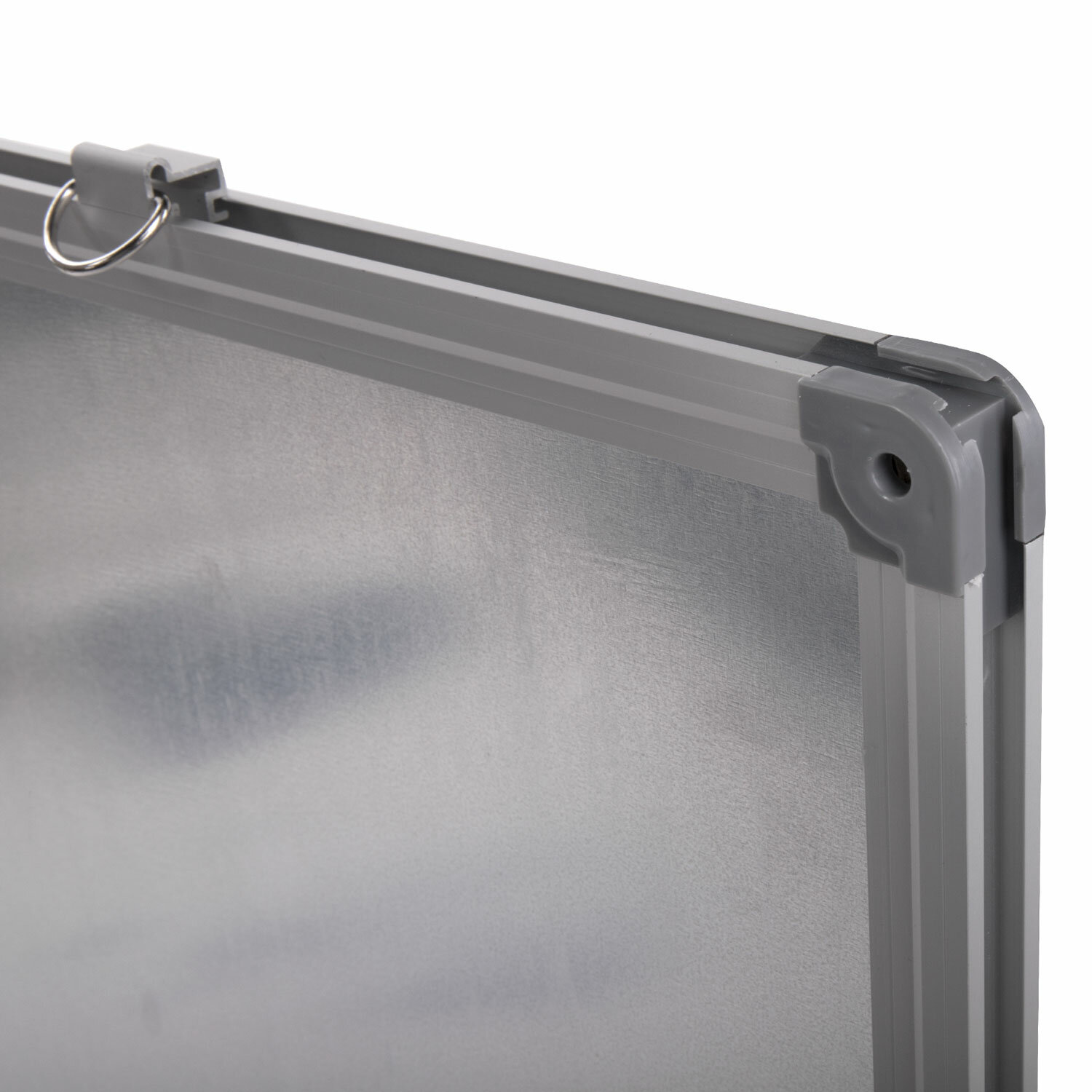 Лаковое покрытие предназначено для письма специальными маркерами для белой доски, а металлическая поверхность позволяет размещать информацию при помощи магнитов. Алюминиевая рама придает доске необходимую прочность. Элементы крепления и полка для принадлежностей входят в комплект. Размер - 60х90 см.