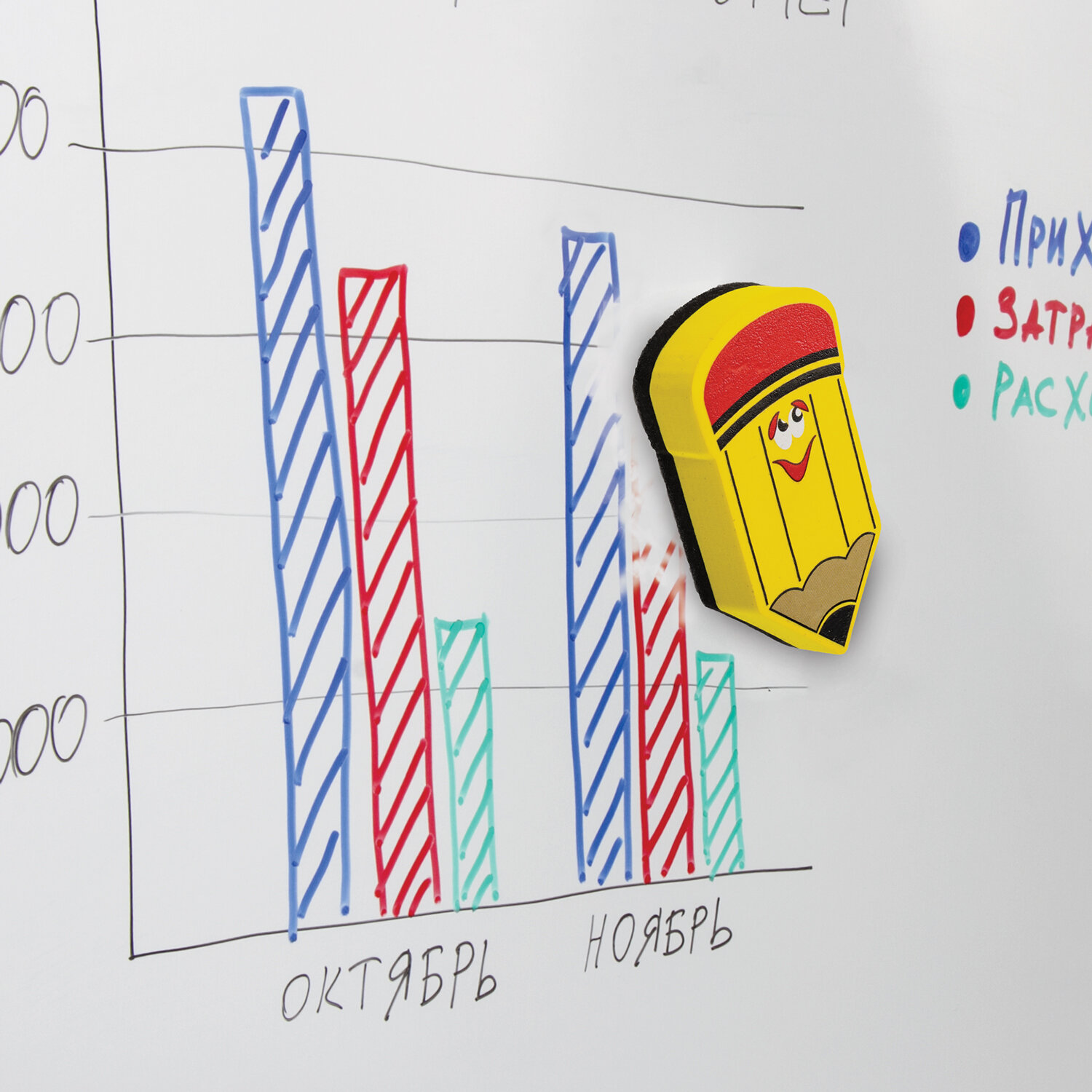 - Стиратель магнитный для магнитно-маркерной доски ЮНЛАНДИЯ "Карандаш", 55х100 мм, желтый с рисунком, 237507