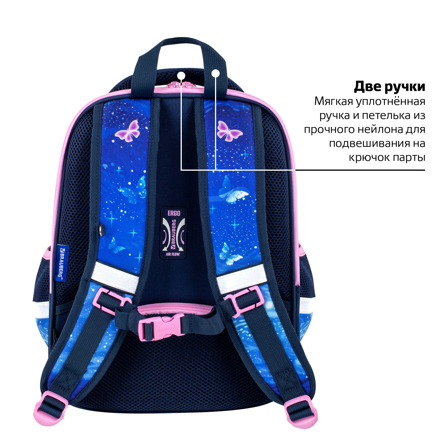 Бабочки на передней панели ранца светятся в темноте! Светящийся эффект реализован с помощью современной и технологичной печати на ткани специальной краской. Эффект свечения достигается за счёт накопления дневного или искусственного света.