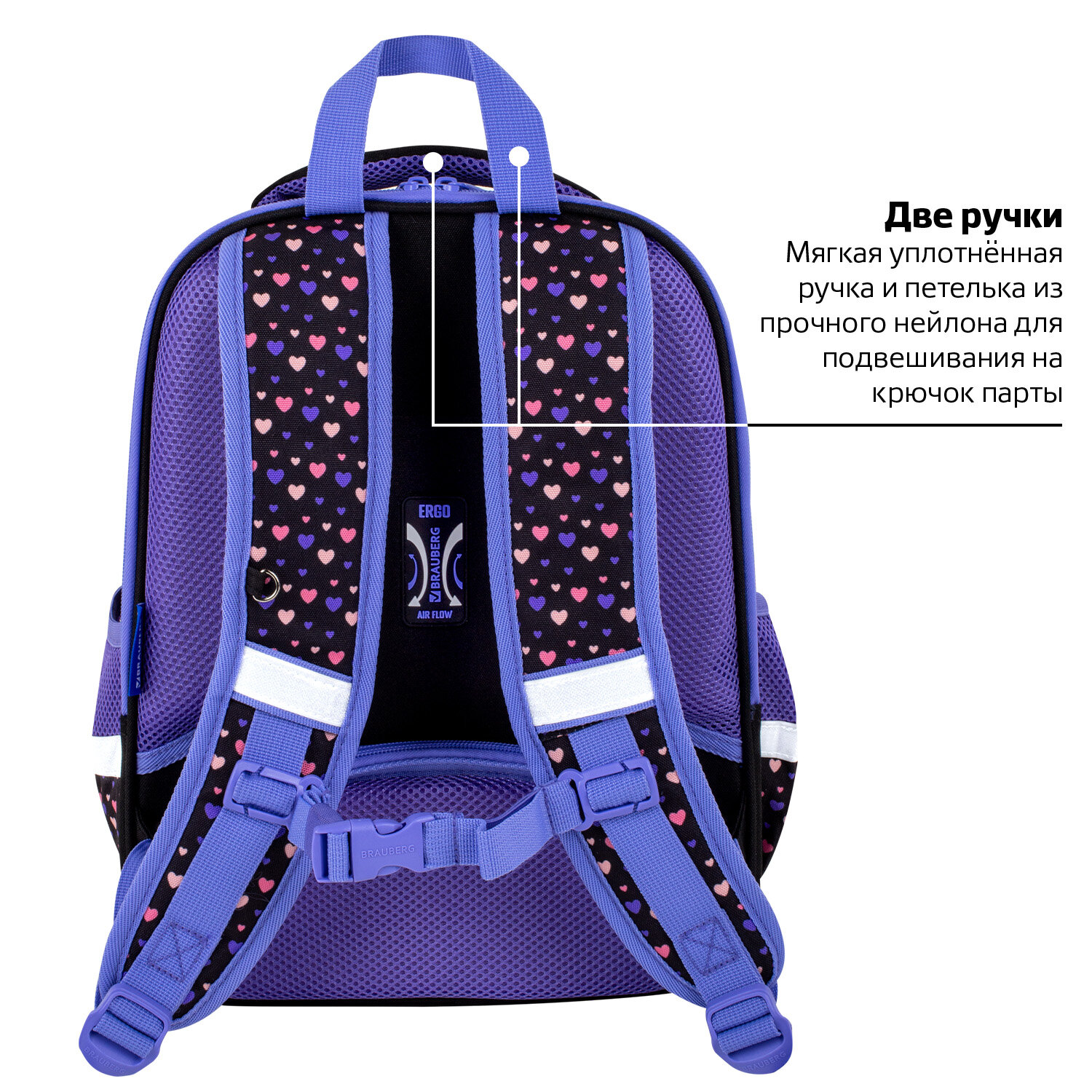 Удобная мягкая вентилируемая спинка с воздушными спонжевыми панелями разработана с учетом анатомических особенностей детей младшего школьного возраста. В процессе эксплуатации конструкция ранца позволит сохранить правильную осанку!
