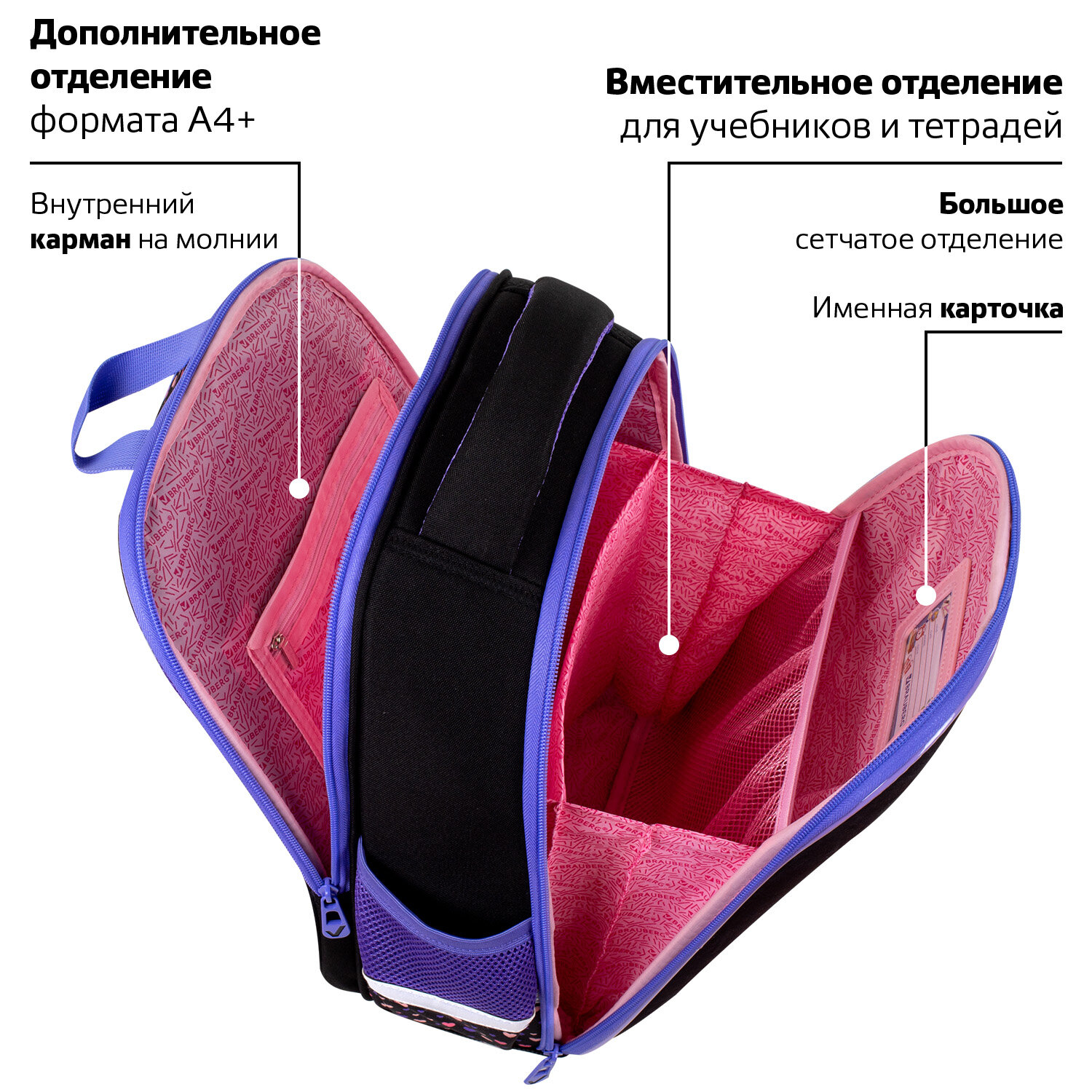 В основном отделении ранца можно легко и быстро разместить учебники и тетради. Внутри основного отделения находится именная карточка школьника и большое отделение из сетки. Такая организация пространства поможет держать принадлежности в сохранности и приучить ребенка к порядку. Ранец широко раскрывается, повышая удобство использования, а благодаря боковым перегородкам содержимое не выскользнет из ранца.