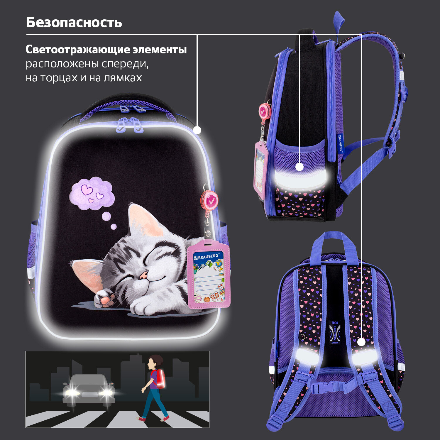 Светоотражающие элементы ранца расположены спереди, на торцах и на лямках. Они необходимы для безопасности ребенка на дороге в темное время суток.