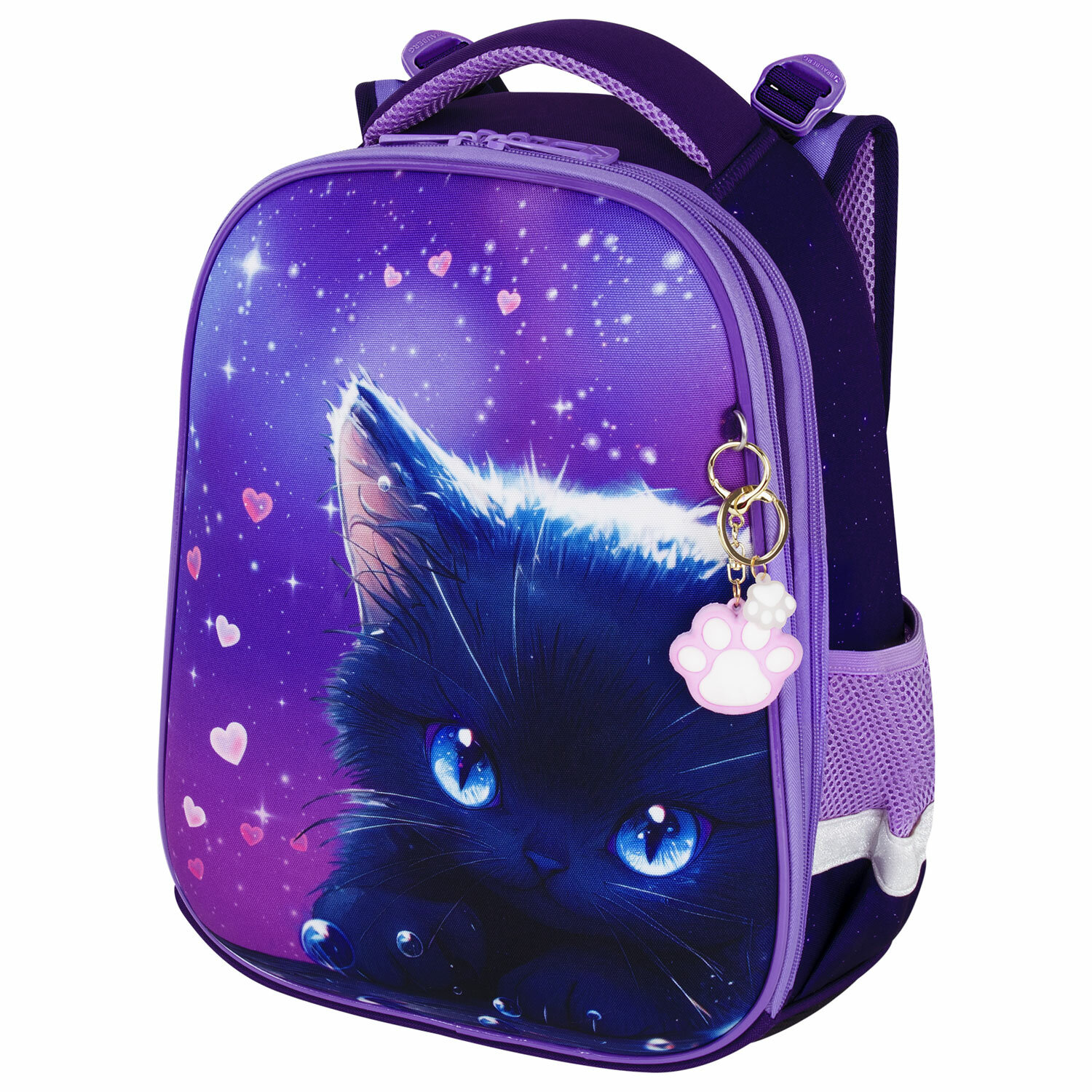 Завораживающий рисунок котенка с большими глазами в сочетании с космическим дизайном приковывает взгляды окружающих, а брелок-подвеска дополняет дизайн ранца.