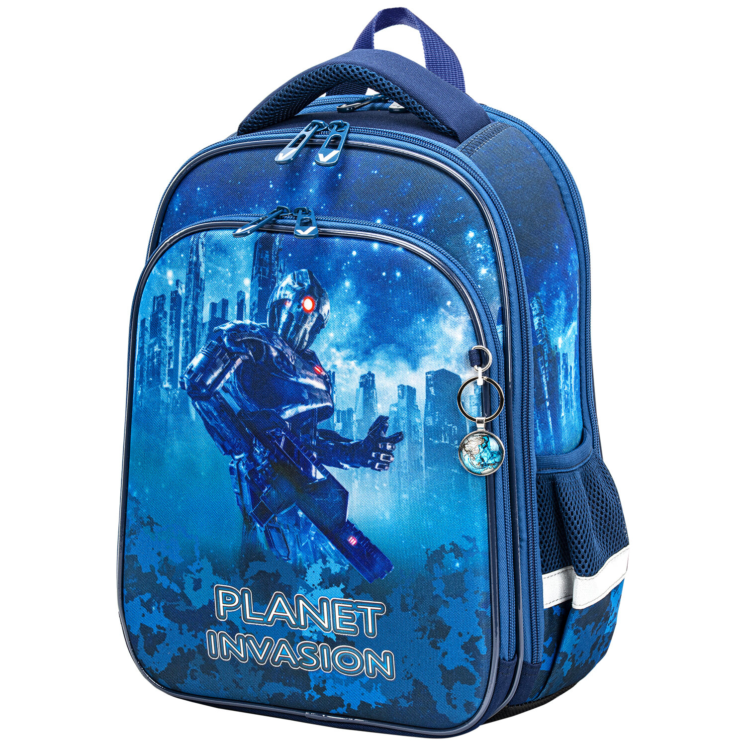 Ранец BRAUBERG QUADRO, 3 отделения, с брелком, "Planet invasion", 37х28х18 см, 270604