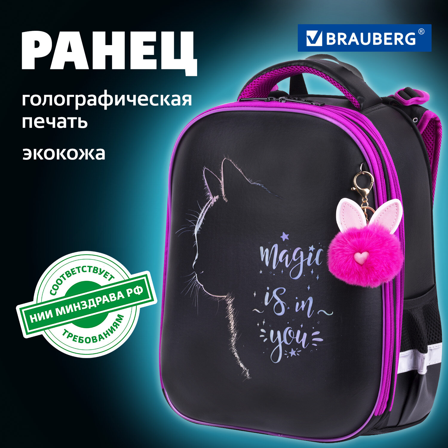 *Заключение №88/51 от 10.08.2023 г. Ранец BRAUBERG SHINY, 2 отделения, с брелоком, "Magic cat", 38х28х14 см, 271381