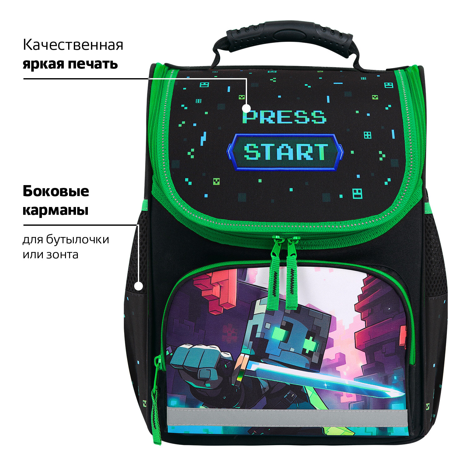 Светоотражающие элементы ранца расположены спереди на переднем кармане, на торцах и на лямках, а также дополнительно верхняя крышка прошита специальной светоотражающей лентой. Это необходимо для безопасности ребёнка в темное время суток.
