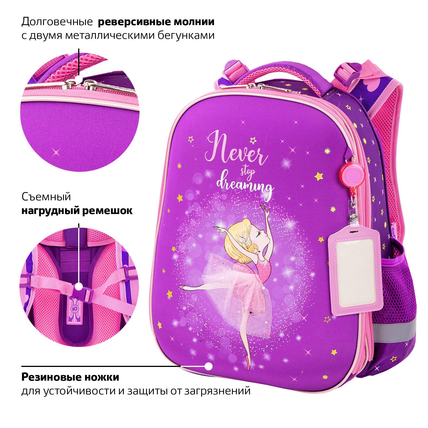 В комплекте с ранцем поставляется бейдж для пропуска на рулетке. Для его надёжной фиксации на одной из лямок ранца имеется специальное металлическое кольцо. Это очень удобно и экономит массу времени - ребенок просто прикладывает пропуск к турникету, вытягивая его на нужное расстояние, а затем рулетка автоматически возвращается обратно. Пропуск всегда под рукой!