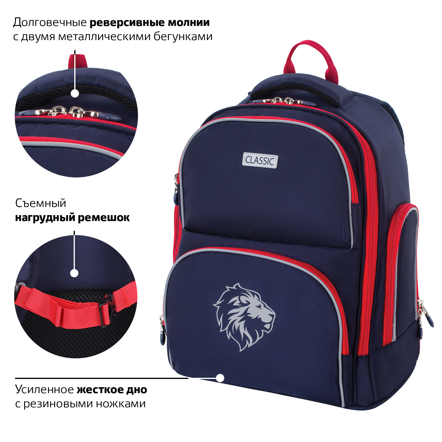 Рюкзак упакован в плотный ПЭТ пакет с замком Zip Lock и ручками, который сохранит качество и товарный вид при хранении и транспортировке. Рюкзак BRAUBERG CLASSIC, легкий каркас, премиум материал, "Lion", синий, 37х32х21 см, 228829