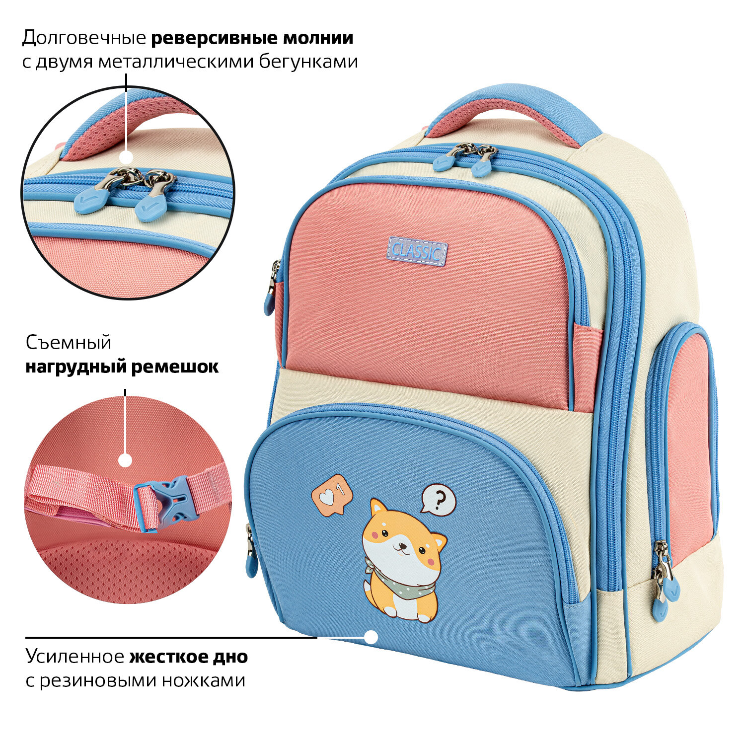 Усиленное жесткое дно не прогибается под весом учебников, обеспечивает устойчивость рюкзака и сохраняет содержимое, легко очищается.