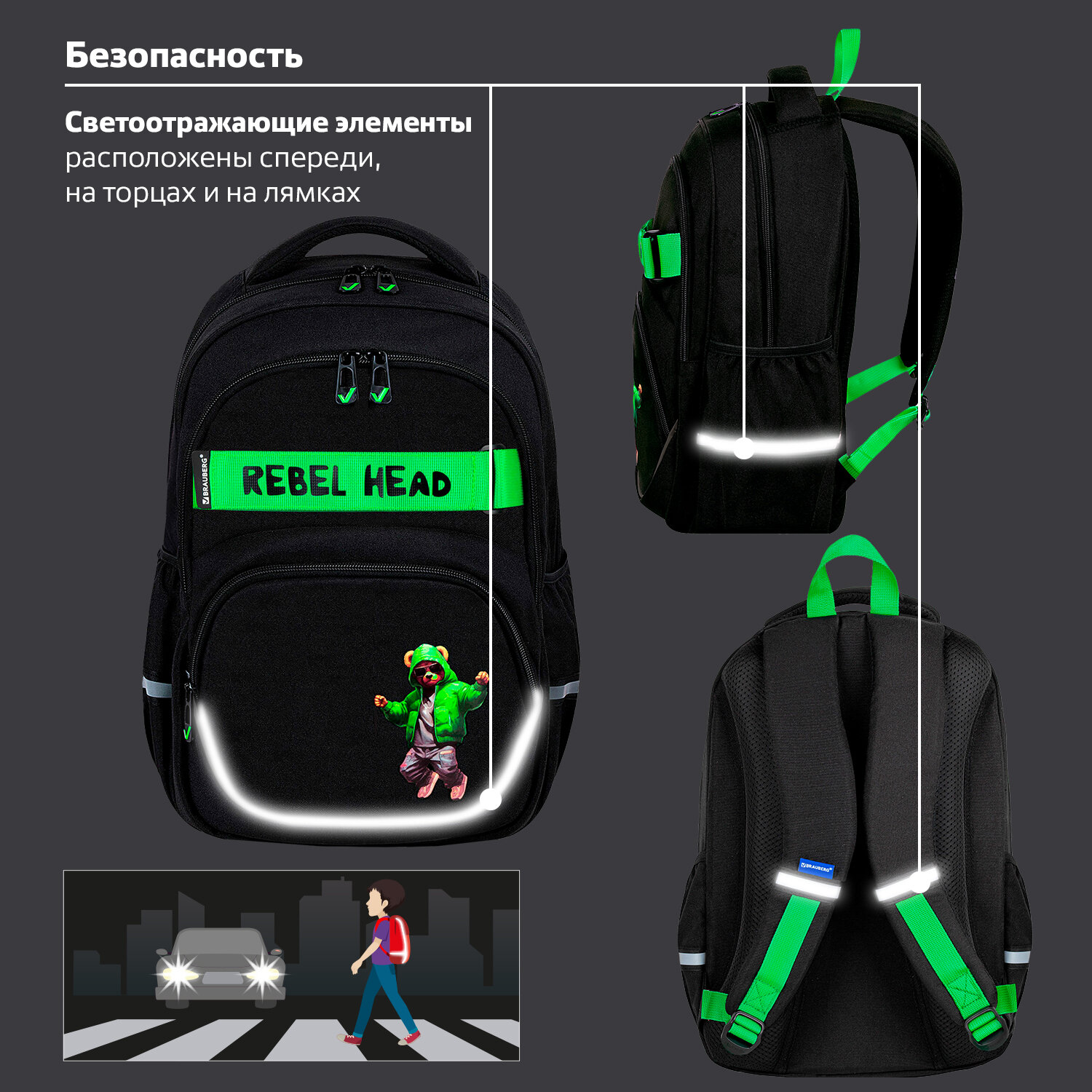 Светоотражающие элементы расположены спереди, на торцах и на лямках. Они обеспечивают безопасность ребёнка в тёмное время суток.