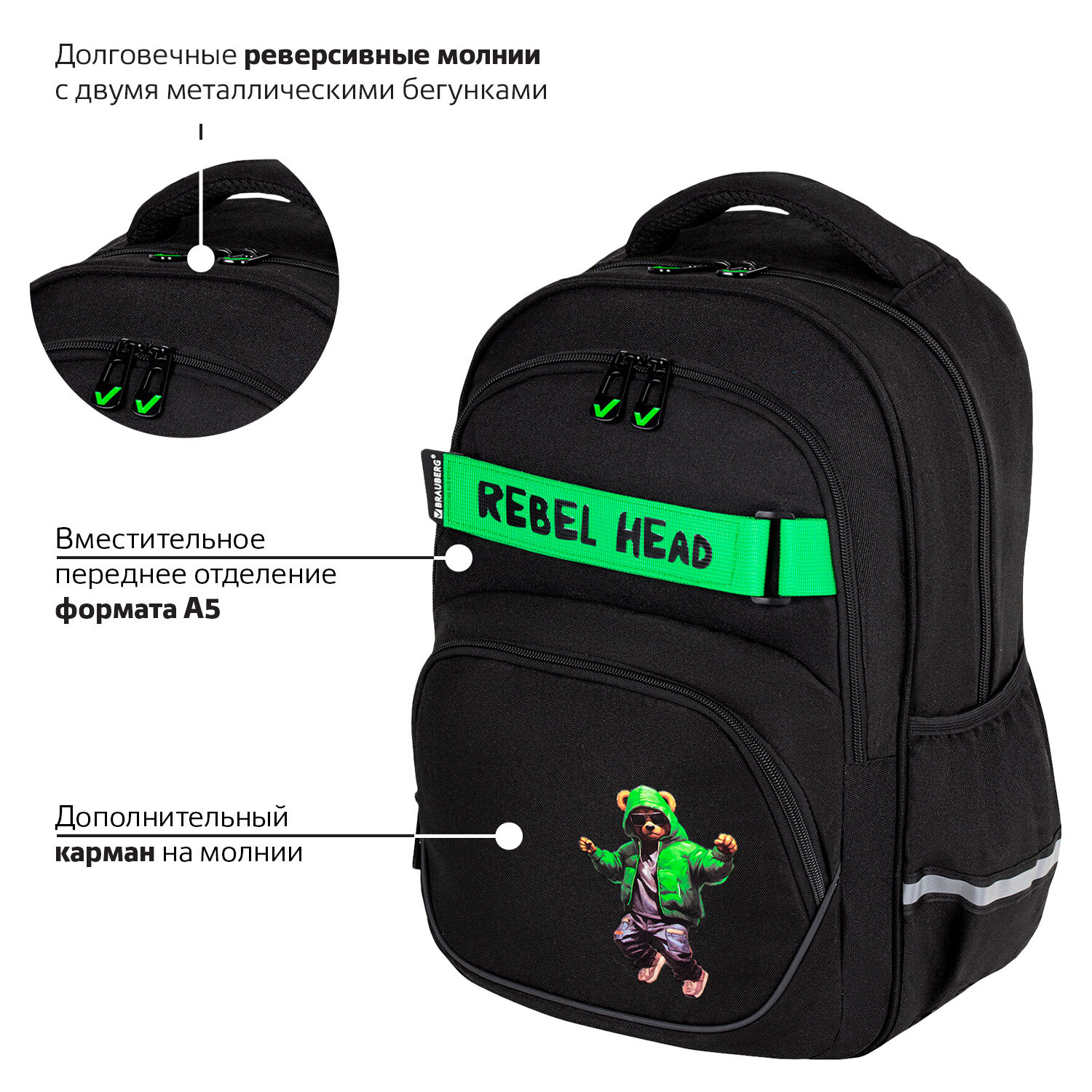 В основном отделении рюкзака можно легко разместить учебники и тетради формата А4+, а также воспользоваться прижимным отделением и дополнительным карманом на молнии. Также в основном отделении находится именная карточка школьника. Внутри фронтального отделения расположен органайзер для канцтоваров, карман для телефона и отделение из сетки. Большое переднее отделение на молнии вмещает тетради и учебники формата А5. Такая организация пространства поможет сохранить принадлежности в порядке и приучить ребёнка к аккуратности.