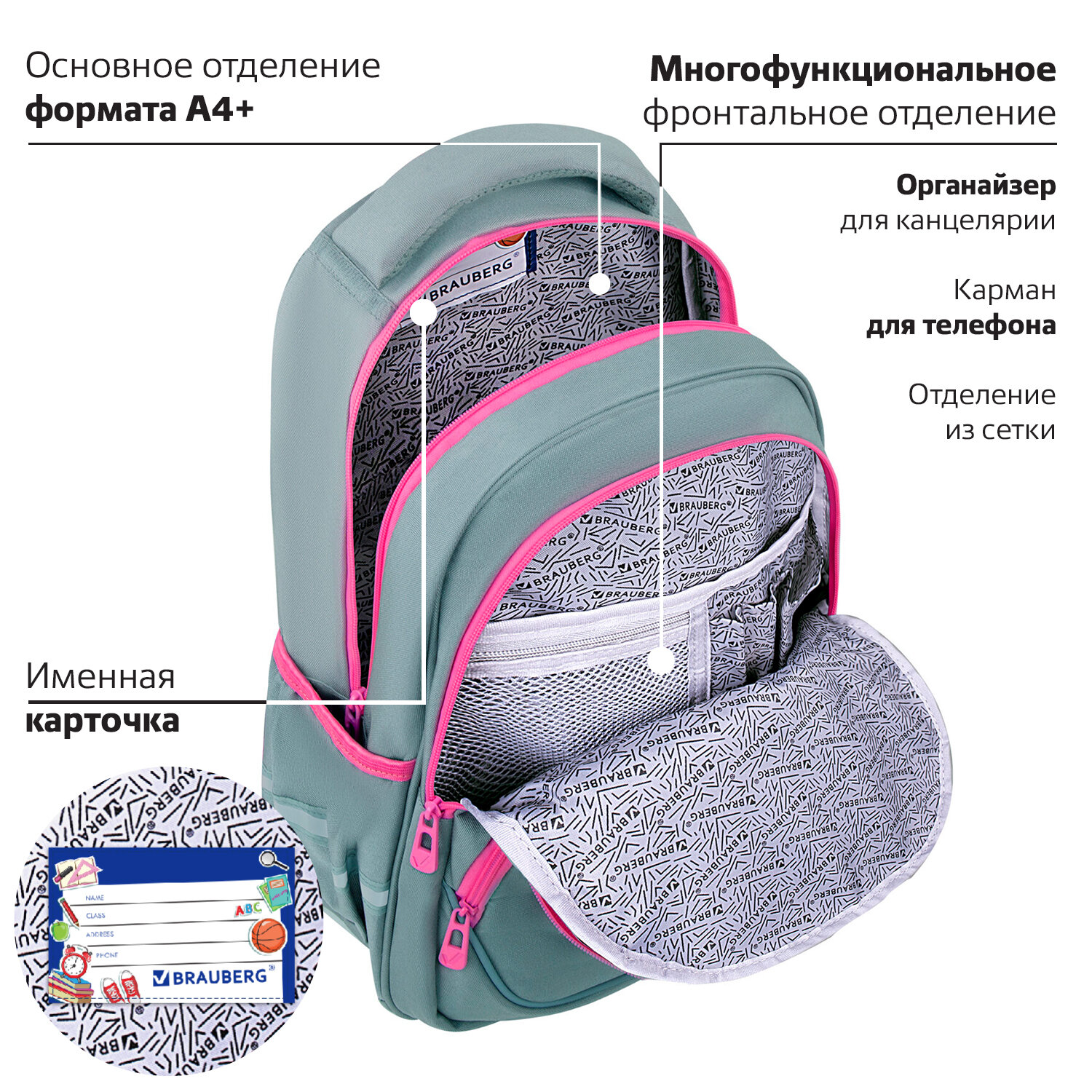 В основном отделении рюкзака можно легко разместить учебники и тетради формата А4+, а также воспользоваться прижимным отделением и дополнительным карманом на молнии. Также в основном отделении находится именная карточка школьника. Внутри фронтального отделения расположен органайзер для канцтоваров, карман для телефона и отделение из сетки. Большое переднее отделение на молнии вмещает тетради и учебники формата А5. Такая организация пространства поможет сохранить принадлежности в порядке и приучить ребёнка к аккуратности.