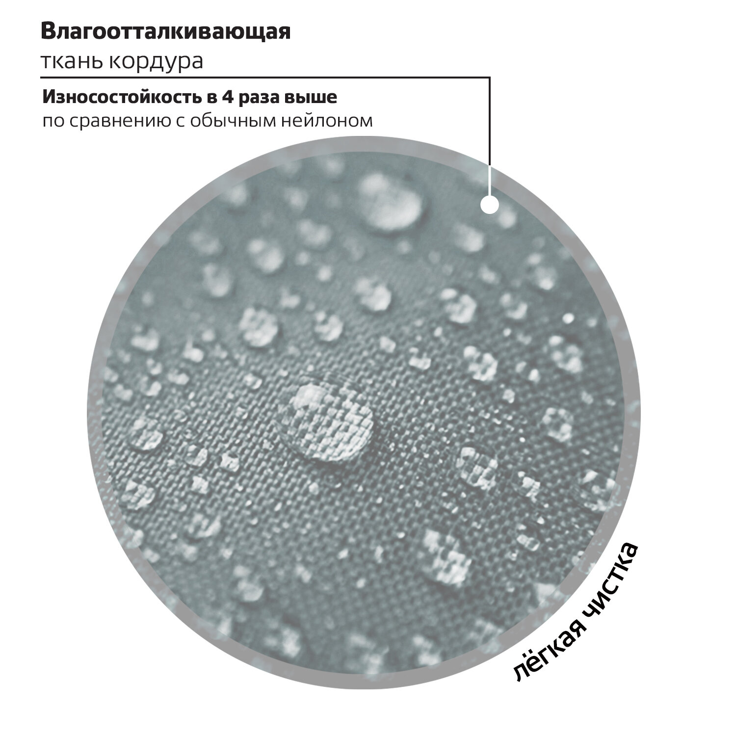 Рюкзак изготовлен из высококачественной влагоотталкивающей нейлоновой ткани – кордура, в которой за счёт особой структуры нити достигнута четырёхкратная стойкость к истиранию по сравнению с обычным нейлоном. Ткань легко чистится.