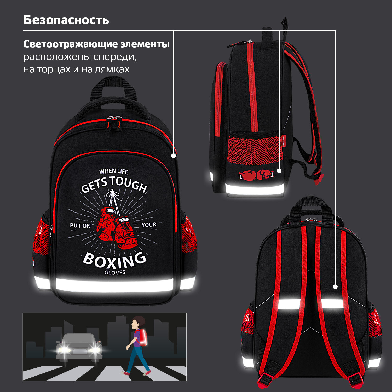 - Рюкзак ПИФАГОР SCHOOL, 1 отделение, 3 кармана, "Boxing", 38x28х14 см, 272077