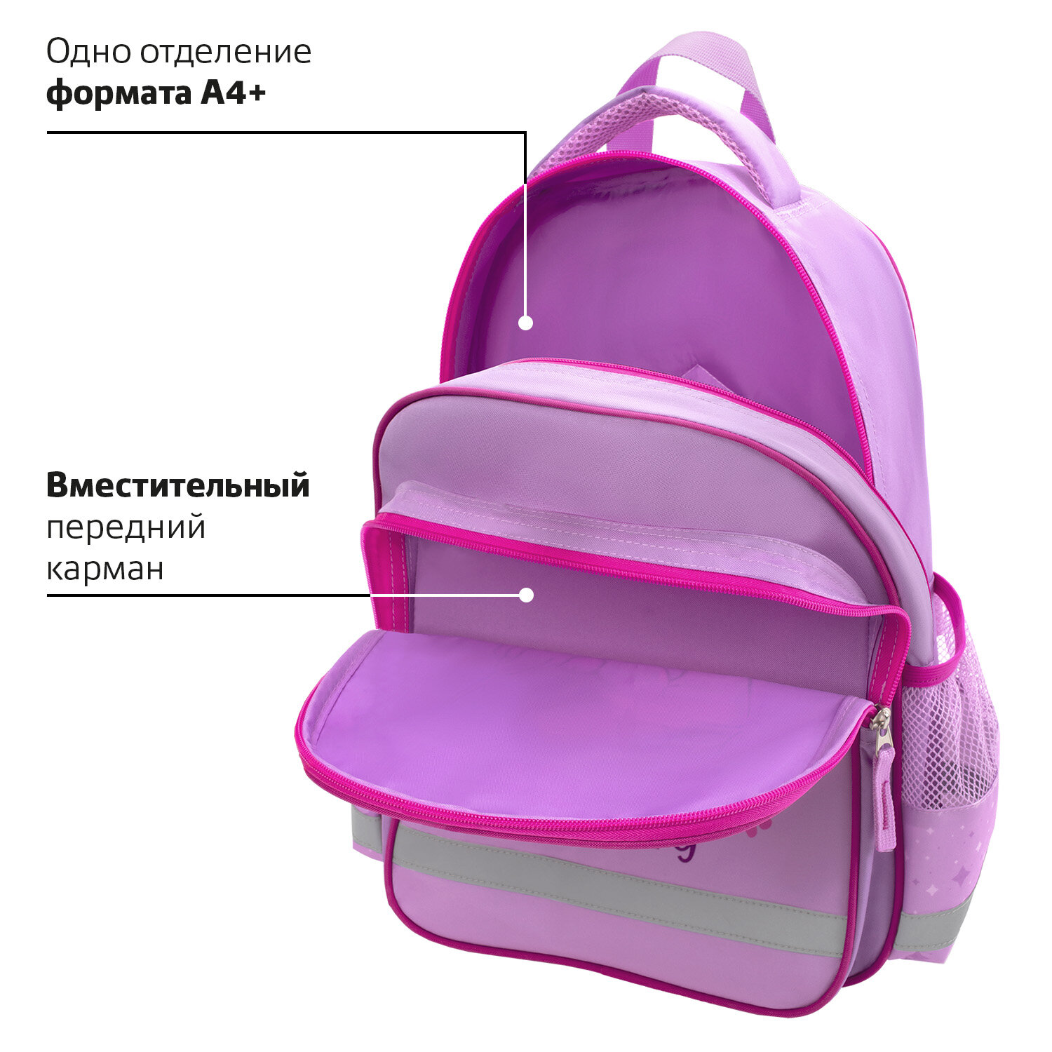 Рюкзак имеет 1 вместительное отделение на молнии, 1 передний карман и 2 боковых. Оптимальный размер рюкзака позволяет вместить все необходимые школьные принадлежности. Мягкие широкие регулируемые лямки способствуют оптимальному распределению веса.