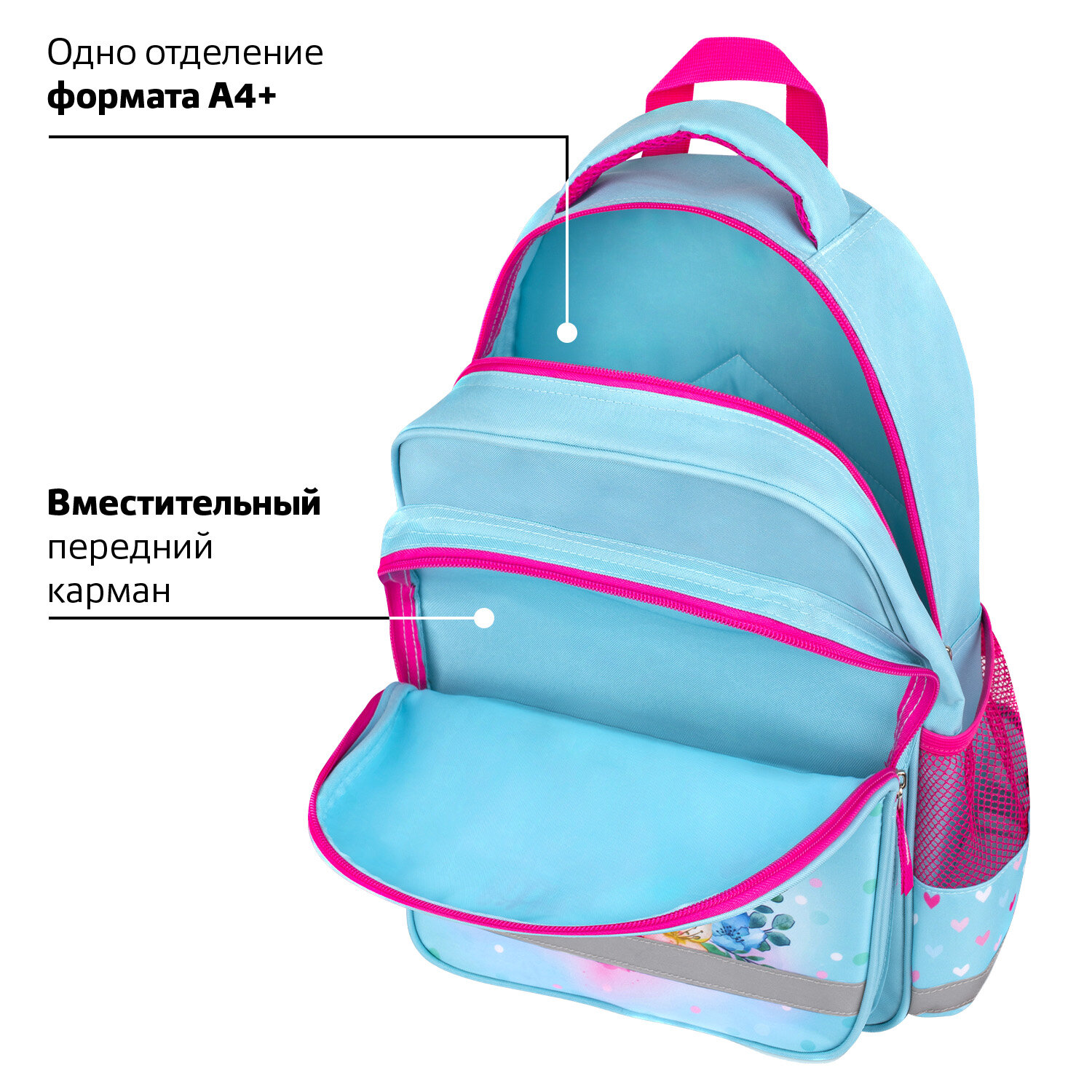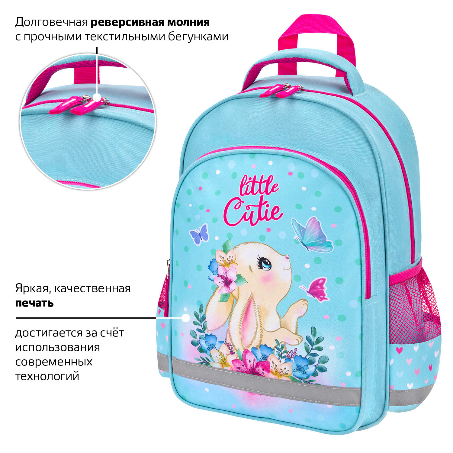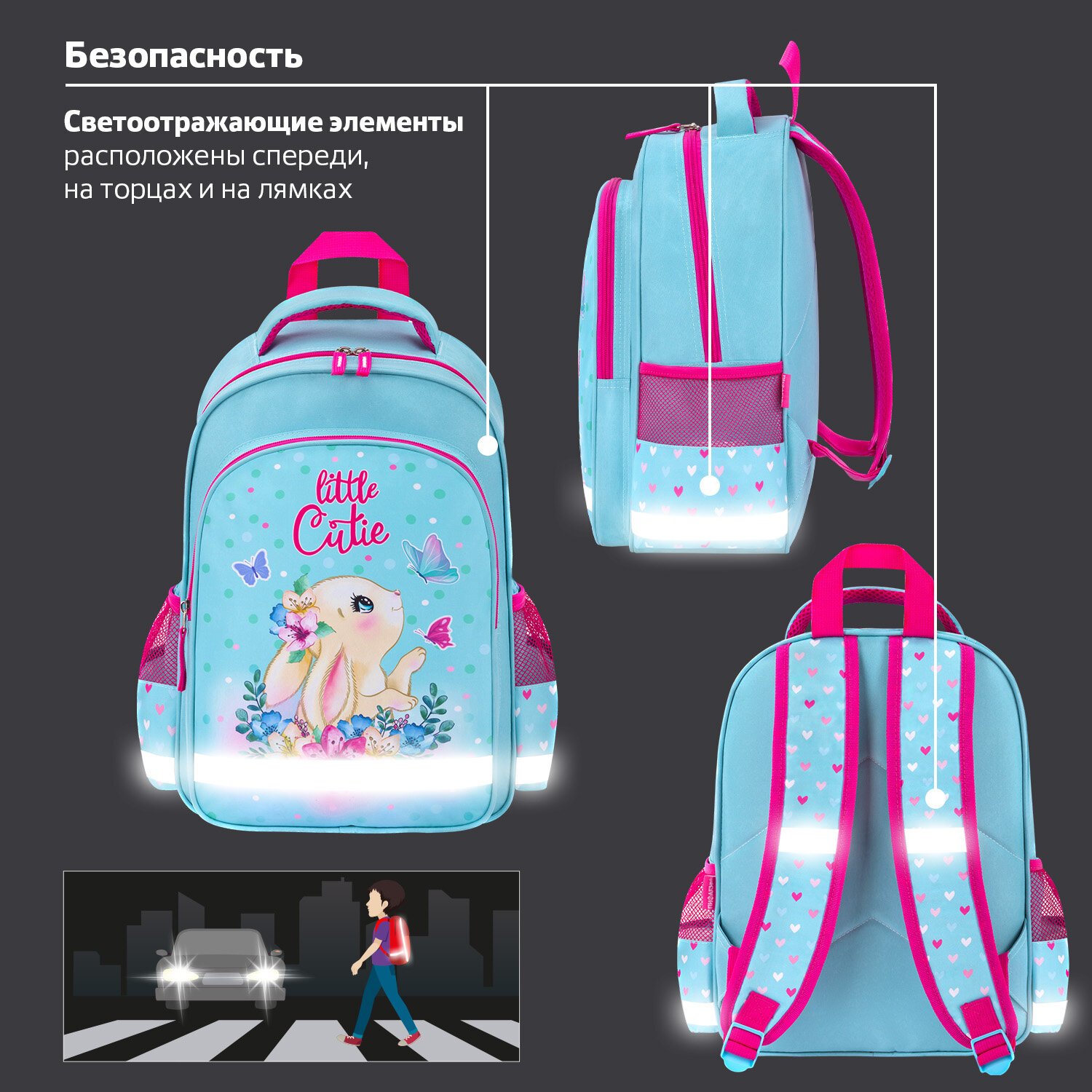 У рюкзака есть удобная ручка из ткани для переноски и петелька для подвешивания на крючок парты. Яркая и качественная печать, насыщенные цвета рисунков достигаются благодаря использованию современных технологий печати на ткани. Светоотражающие элементы со всех сторон рюкзака обеспечивают безопасность в темное время суток.