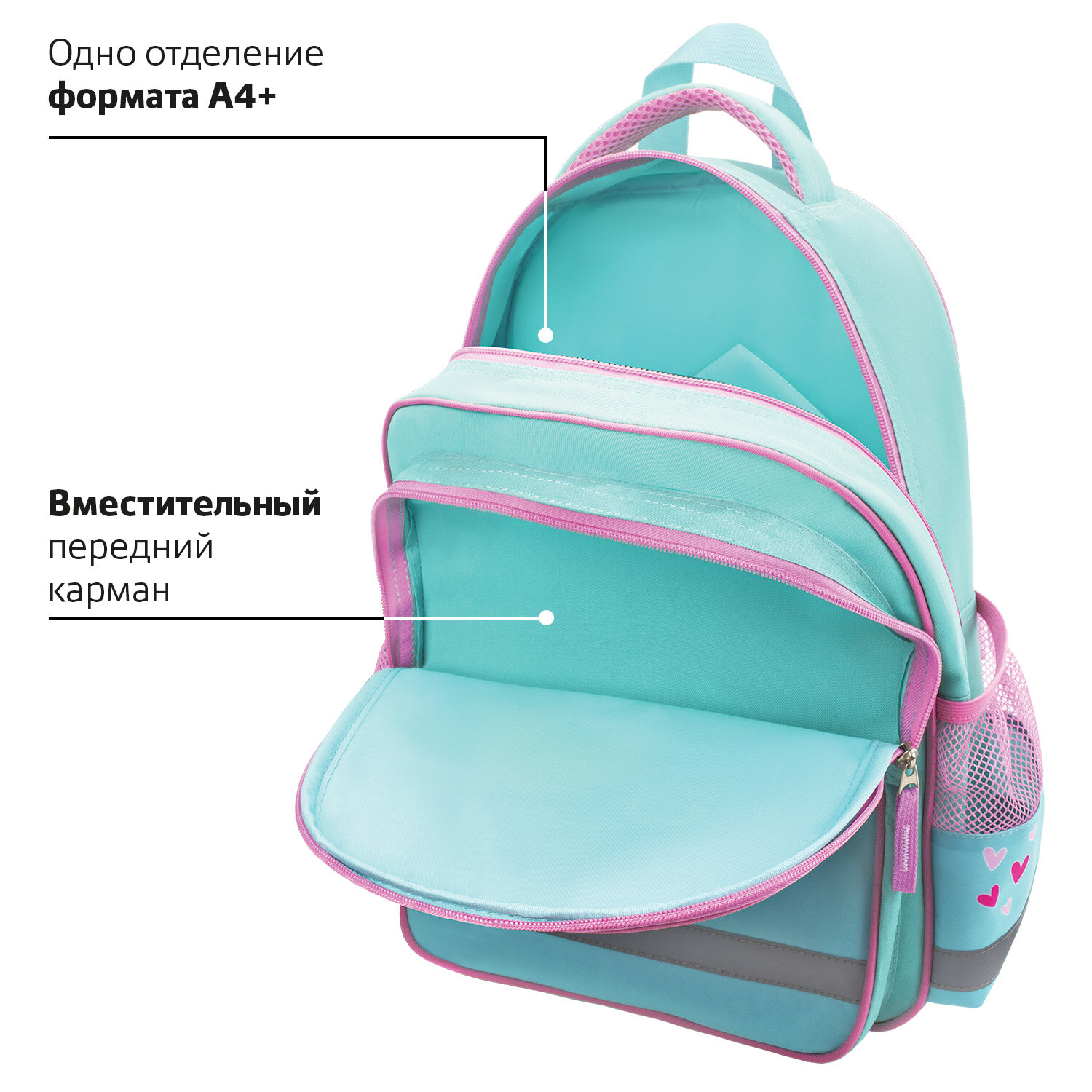 Рюкзак имеет 1 вместительное отделение на молнии, 1 передний карман и 2 боковых. Оптимальный размер рюкзака позволяет вместить все необходимые школьные принадлежности. Мягкие широкие регулируемые лямки способствуют оптимальному распределению веса.