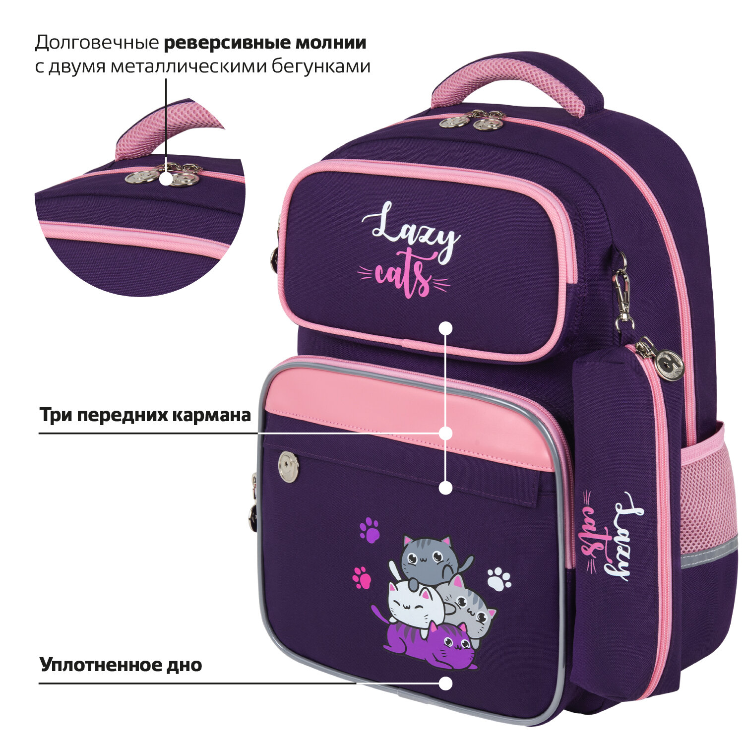 Рюкзак упакован в плотный ПЭТ пакет с замком Zip Lock с ручками, который сохранит качество и товарный вид при хранении и транспортировке. Рюкзак ЮНЛАНДИЯ COMPLETE, с пеналом в комплекте, эрго-спинка, "Cat pile", 42х29х14 см, 272056