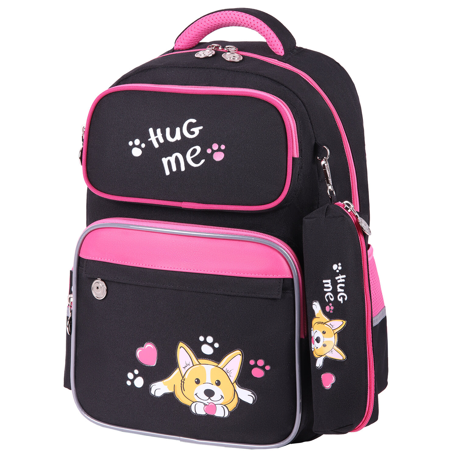 Рюкзак снабжен усиленной ручкой из ткани и петелькой для подвешивания на крючок, а также фиксатором для тетрадей. Светоотражающие элементы с четырех сторон обеспечивают безопасность в темное время суток.